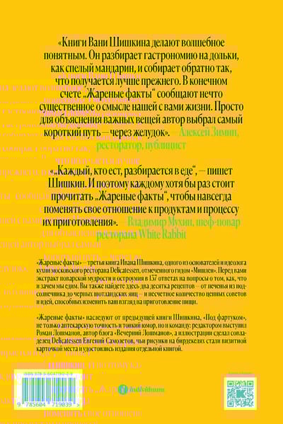 «Жареные факты» — третья книга Ивана Шишкина, одного из основателей и идеолога кухни московского ресторана Delicatessen, отмеченного гидом «Мишлен». Перед вами экстракт поварской мудрости и остроумия в 137 ответах на вопросы о том, как, что и зачем мы едим. Почему в южных странах апельсины не оранжевые, а зеленые, какие курицы летают самолетами, почему с помощью киви легче всего замариновать мясо, можно ли есть медуз и чем опасна ваниль? Вы также найдете здесь два десятка рецептов — от печенья из подсолнечника до черных шотландских яиц — и несчетное количество ценных советов и идей, способных изменить ваш взгляд на приготовление пищи.