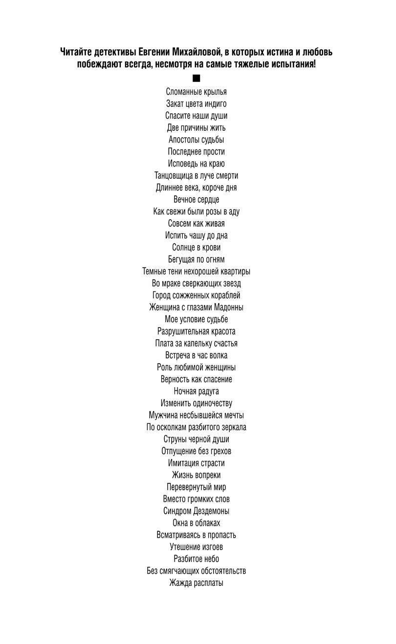 Сотрудники фирмы, где работают Даша и Влад, в курсе их отношений. Знают они и о том, что во Влада отчаянно и безответно влюблена начальница Даши… Буря страстей переворачивает вверх дном не только их частную жизнь, но и весь холдинг. Сами того не желая, влюбленные становятся виновниками целой серии трагедий, остановить которую может только опытный частный детектив Сергей Кольцов… В прошлом Евгения Михайлова работала журналистом и провела немало журналистских расследований, а теперь сочиняет преступления сама. Но невыдуманные жизненные истории по-прежнему служат для Евгении вдохновением, и именно на реальных событиях она основывает свои сюжеты. Каждый ее остросюжетный роман — это настоящий детектив-событие.