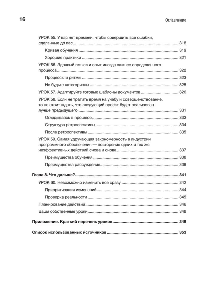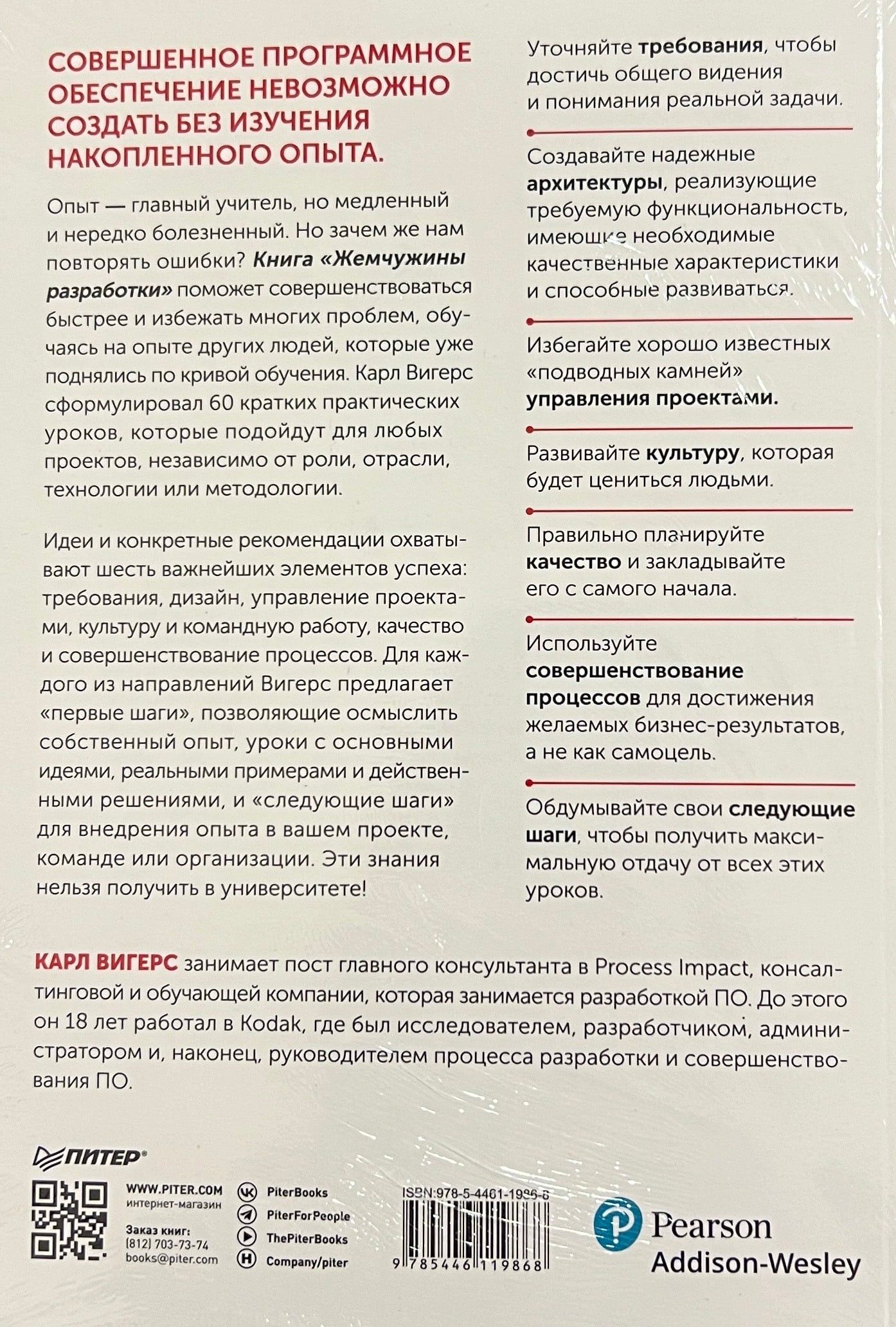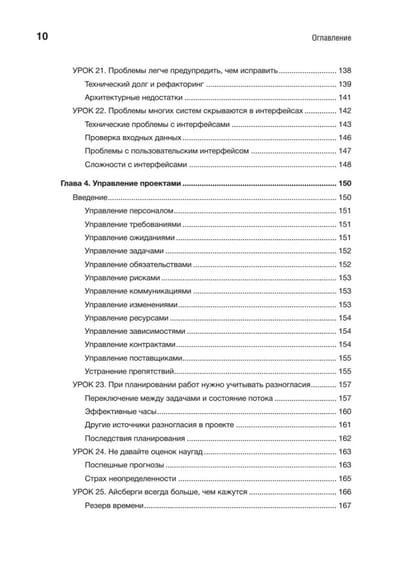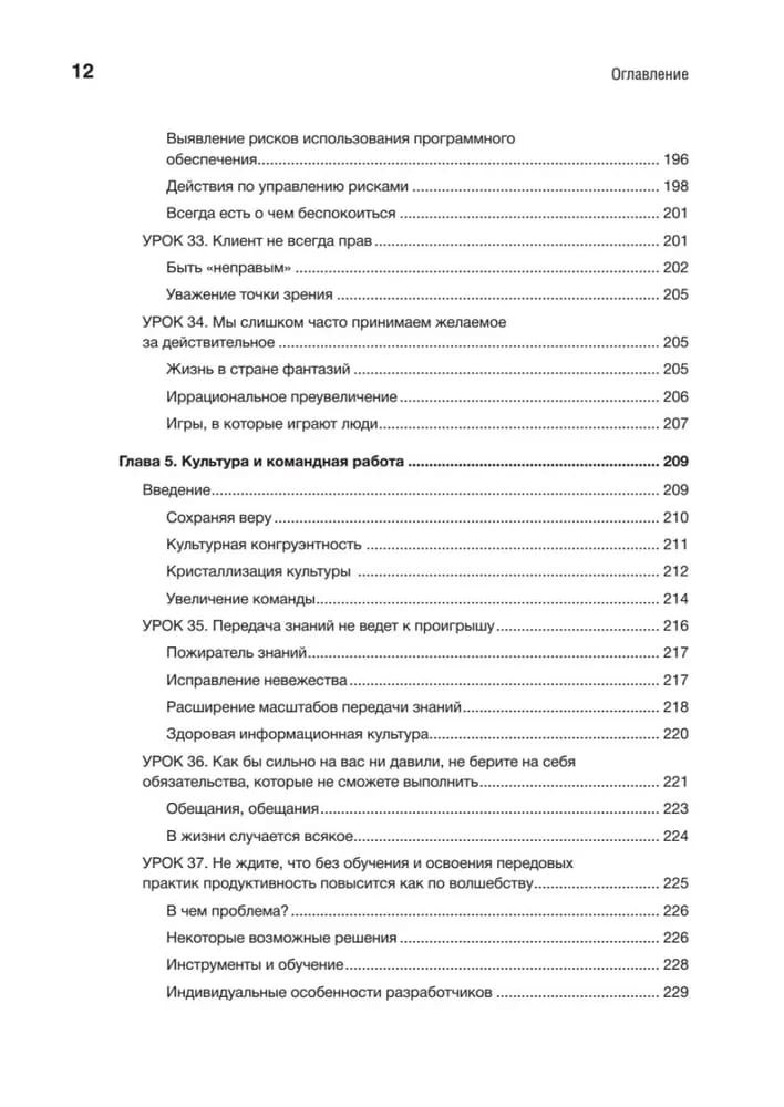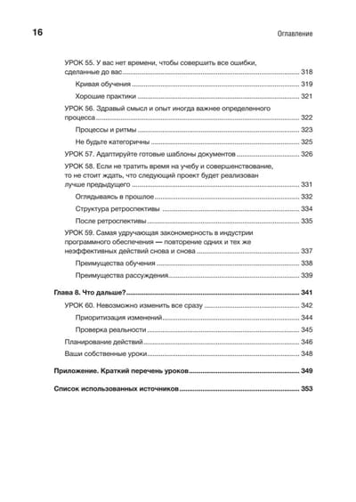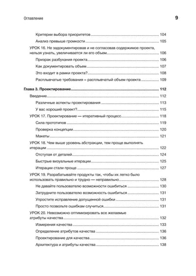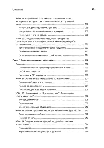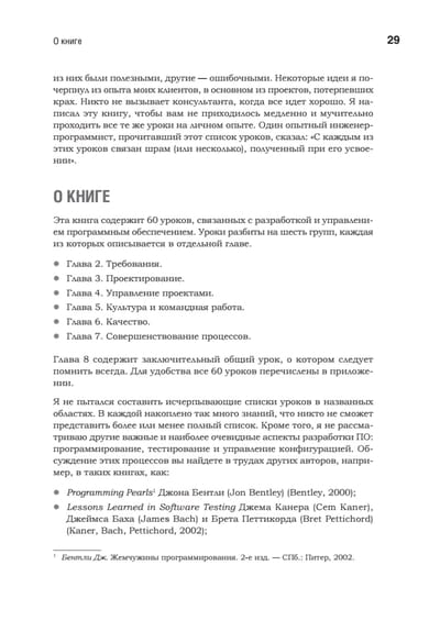 Идеи и конкретные рекомендации охватывают шесть важнейших элементов успеха: требования, дизайн, управление проектами, культуру и командную работу, качество и совершенствование процессов. Для каждого из направлений Вигерс предлагает «первые шаги», позволяющие осмыслить собственный опыт, уроки с основными идеями, реальными примерами и действенными решениями и «следующие шаги» для внедрения опыта в вашем проекте, команде или организации. Эти знания нельзя получить в университете!