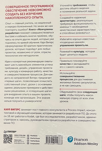 Опыт — главный учитель, но медленный и нередко болезненный. Но зачем же нам повторять ошибки? Книга «Жемчужины разработки» поможет совершенствоваться быстрее и избежать многих проблем, обучаясь на опыте других людей, которые уже поднялись по кривой обучения. Карл Вигерс сформулировал 60 кратких практических уроков, которые подойдут для любых проектов, независимо от роли, отрасли, технологии или методологии.