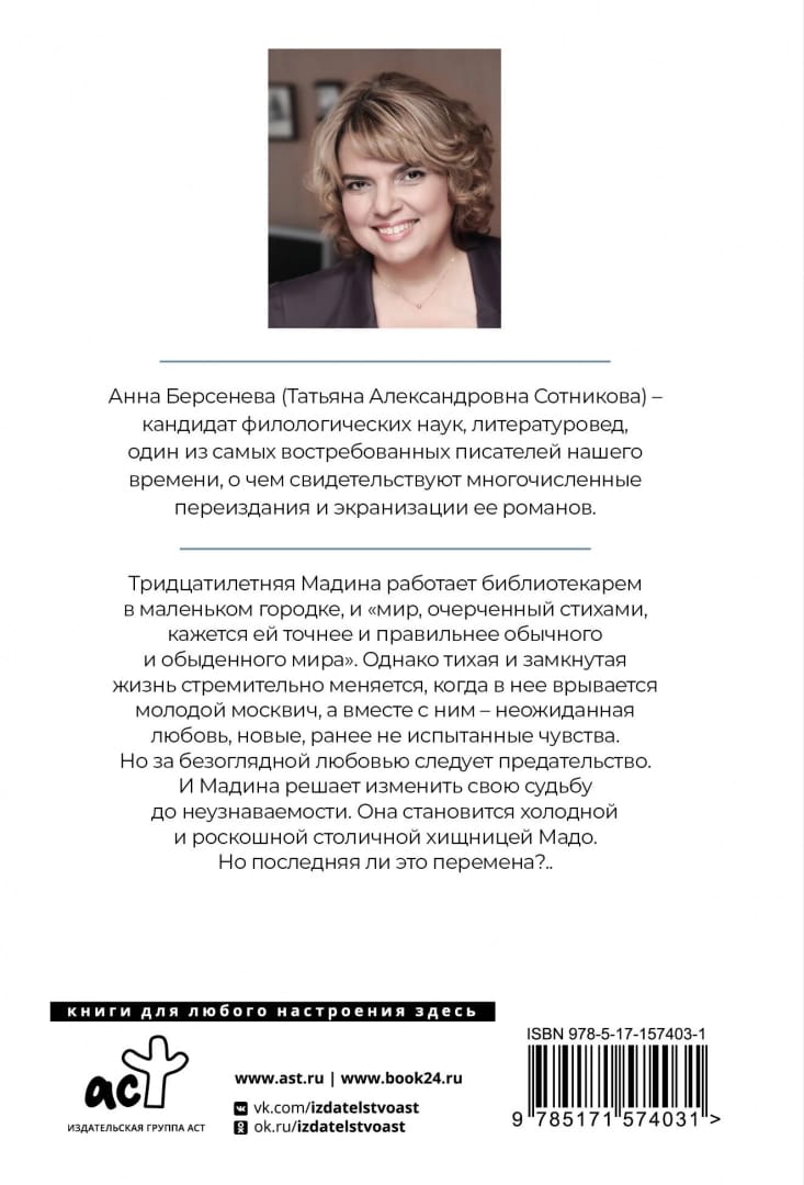 Тридцатилетняя Мадина работает библиотекарем в маленьком городке, и "мир, очерченный стихами, кажется ей точнее и правильнее обычного и обыденного мира". Однако тихая и замкнутая жизнь стремительно меняется, когда в нее врывается молодой москвич, а вместе с ним – неожиданная любовь, новые, ранее не испытанные чувства. Но за безоглядной любовью следует предательство. И Мадина решает изменить свою судьбу до неузнаваемости. Она становится холодной и роскошной столичной хищницей Мадо. Но последняя ли это перемена?..