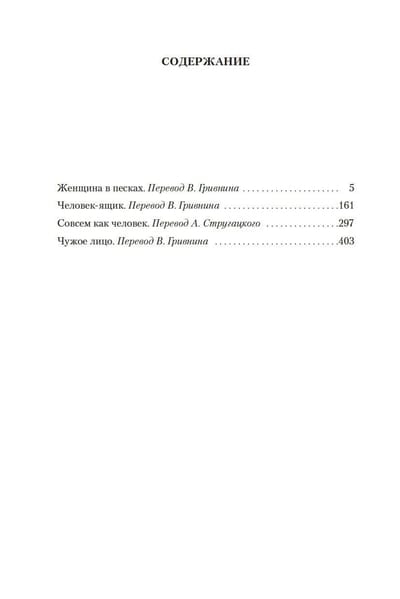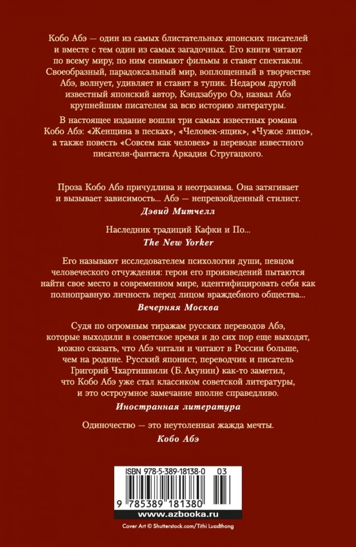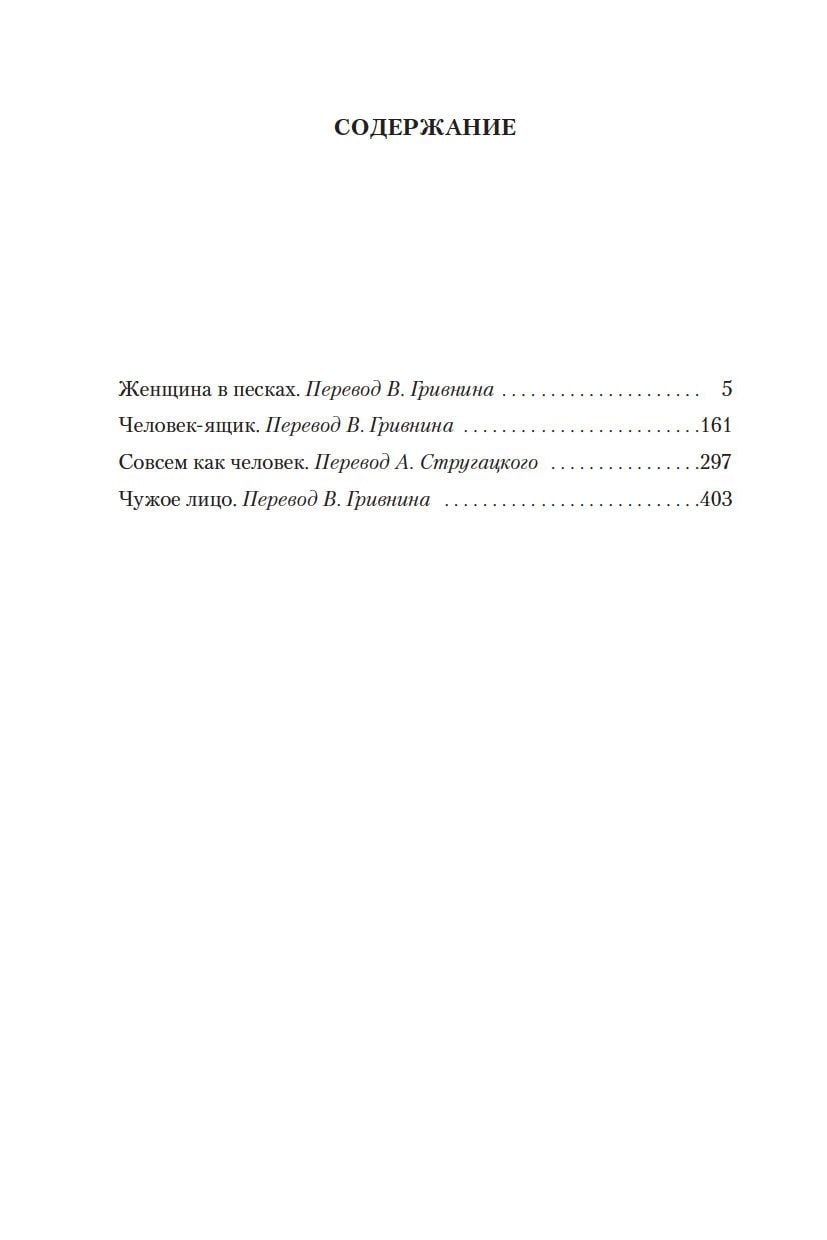 В настоящее издание вошли три самых известных романа Кобо Абэ: «Женщина в песках», «Человек-ящик», «Чужое лицо», а также повесть «Совсем как человек» в переводе известного писателя-фантаста Аркадия Стругацкого.