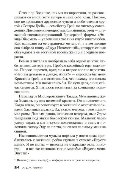 Анна Фокс живет отшельницей в своем нью-йоркском доме. Около года тому назад она пережила сильнейший стресс, поэтому не может выходить на улицу. Близкие оставили Анну, хотя она каждый день разговаривает с ними по телефону. И все же ей хочется верить, что жизнь изменится к лучшему. Она коротает время за просмотром старых фильмов, вспоминает счастливые дни, любимую работу... и от скуки порой подглядывает за соседями. Однажды в доме, расположенном через сквер, появляются новые жильцы: отец, мать, сын-подросток. Благополучная, просто идеальная семья. Но как-то раз Анна, наставив в окно объектив камеры, видит сцену, которая ее шокирует, — сцену жестокого убийства. Женщина поднимает тревогу, но соседи опровергают все, что она говорит. Ей никто не верит — ни полицейские, ни друзья, — и ее мир начинает рушиться... Тогда она решает самостоятельно разобраться, где правда, а где вымысел.