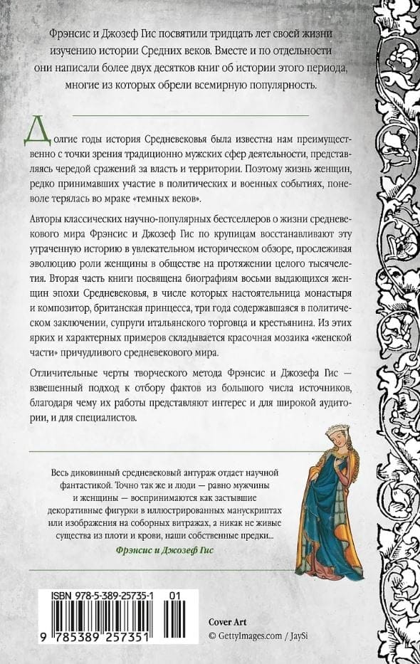 Авторы классических научно-популярных бестселлеров о жизни средневекового мира Фрэнсис и Джозеф Гис по крупицам восстанавливают эту утраченную историю в увлекательном историческом обзоре, прослеживая эволюцию роли женщины в обществе на протяжении целого тысячелетия. Вторая часть книги посвящена биографиям восьми выдающихся женщин эпохи Средневековья, в числе которых настоятельница монастыря и композитор, британская принцесса, три года содержавшаяся в политическом заключении, супруги итальянского торговца и крестьянина. Из этих ярких и характерных примеров складывается красочная мозаика «женской части» причудливого средневекового мира.