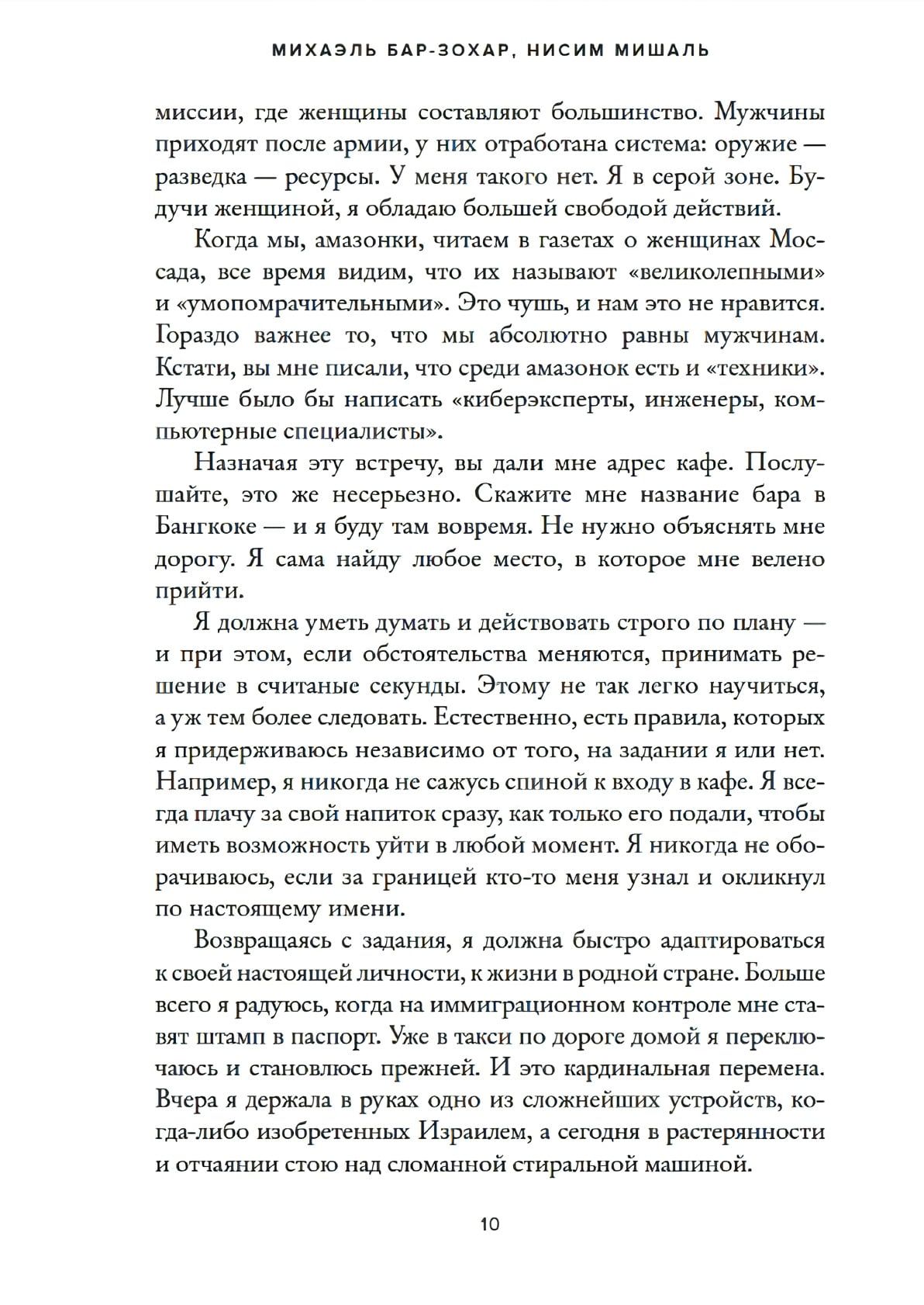 Используя также данные из строго засекреченных источников, как на иврите, так и англоязычных, Нисим Мишаль и Михаэль Бар-Зохар отделяют подлинную информацию от мифов и домыслов, что делает эту книгу уникальной и интересной широкому кругу читателей, интересующихся прошлым и настоящим Израиля и Моссада. Ранее книга издавалась под названием «Амазонки Моссада. Женщины в израильской разведке».