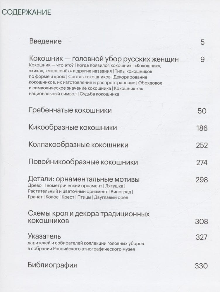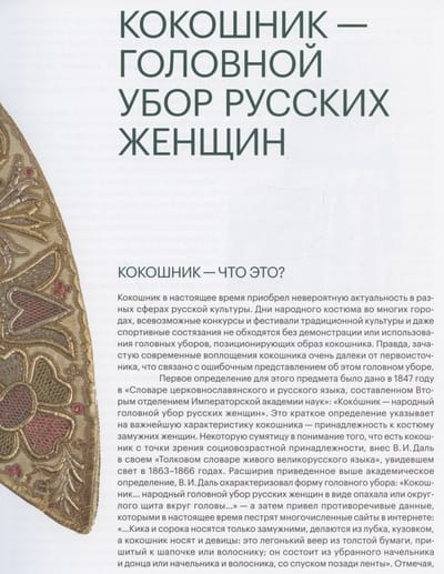 Издание знакомит с историей происхождения как самого предмета, так и его названия, с особенностями бытования и декоративного оформления кокошников. Альбомная часть представляет обширную коллекцию кокошников Российского этнографического музея. Большая часть предметов публикуется впервые.