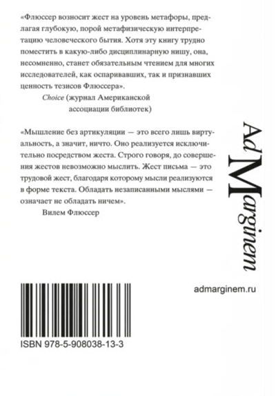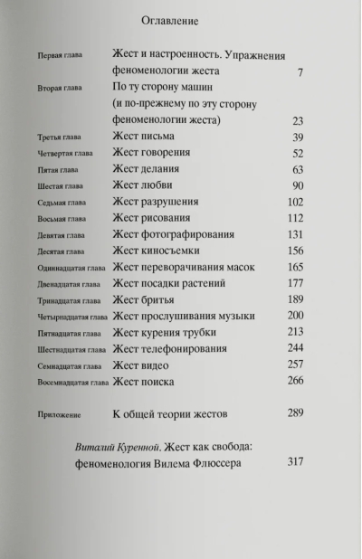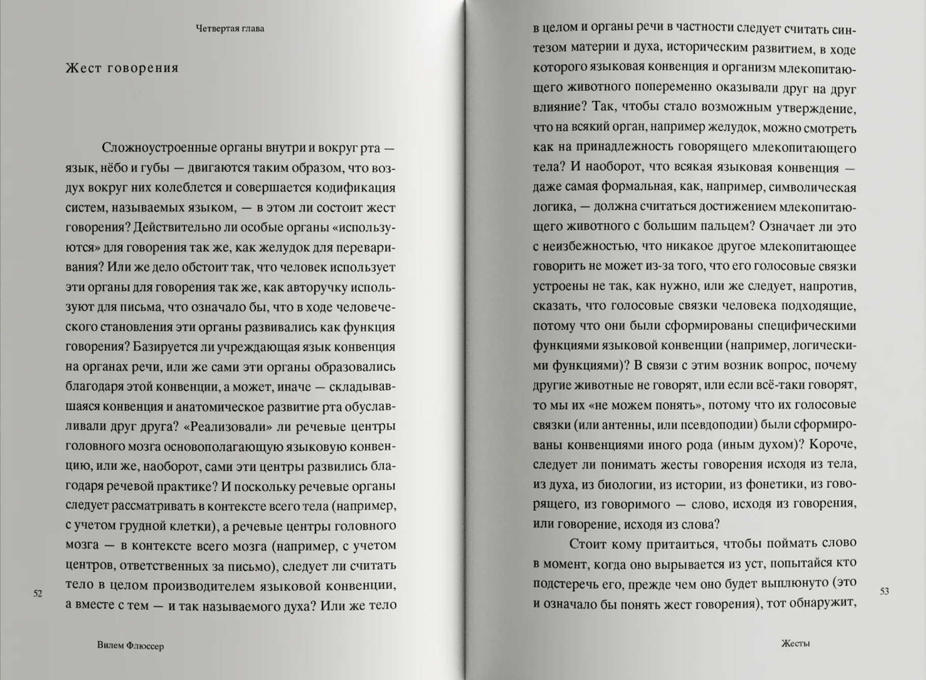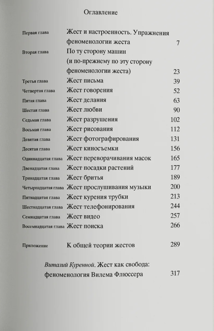 Книга «Жесты» (1991) философа и теоретика медиа Вилема Флюссера (1920–1991) посвящена феноменологии конкретных действий: говорить, писать, мастерить, любить, разрушать и т. д. Из этих действий, или жестов, складывается повседневное, активное бытие-в-мире, а за их анализом угадывается силуэт бытующего феноменолога. Флюссер возвращает философию на землю: быт и повседневность нуждаются в философской прививке, получив которую они открывают перед нами горизонты истории, культуры, политики, религии и науки. При этом автор сосредоточен на телесном жесте — конкретном движении, наделенном смыслом и выражающем свободу человека.
