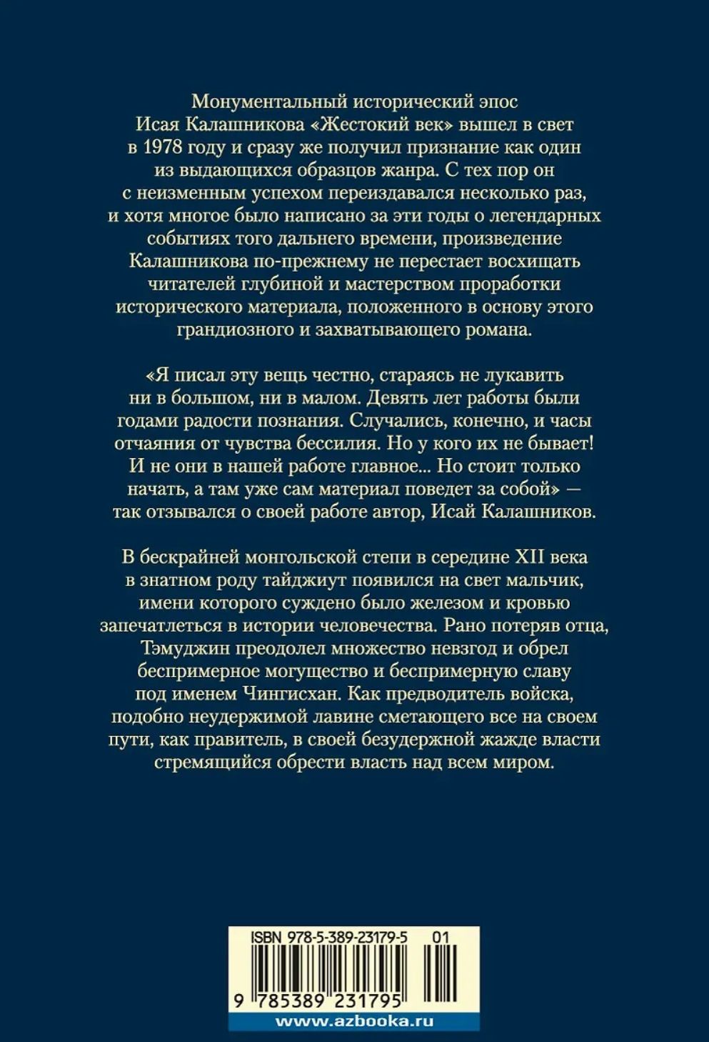 Монументальный исторический эпос Исая Калашникова «Жестокий век» вышел в свет в 1978 году и сразу же получил признание как один из выдающихся образцов жанра. С тех пор он с неизменным успехом переиздавался несколько раз, и хотя многое было написано за эти годы о легендарных событиях того дальнего времени, произведение Калашникова по-прежнему не перестает восхищать читателей глубиной и мастерством проработки исторического материала, положенного в основу этого грандиозного и захватывающего романа. В бескрайней монгольской степи в середине XII века в знатном роду тайджиут появился на свет мальчик, имени которого суждено было железом и кровью запечатлеться в истории человечества. Рано потеряв отца, Тэмуджин преодолел множество невзгод и обрел беспримерное могущество и беспримерную славу под именем Чингисхан. Как предводитель войска, подобно неудержимой лавине сметающего все на своем пути, как правитель, в своей безудержной жажде власти стремящийся обрести власть над всем миром.