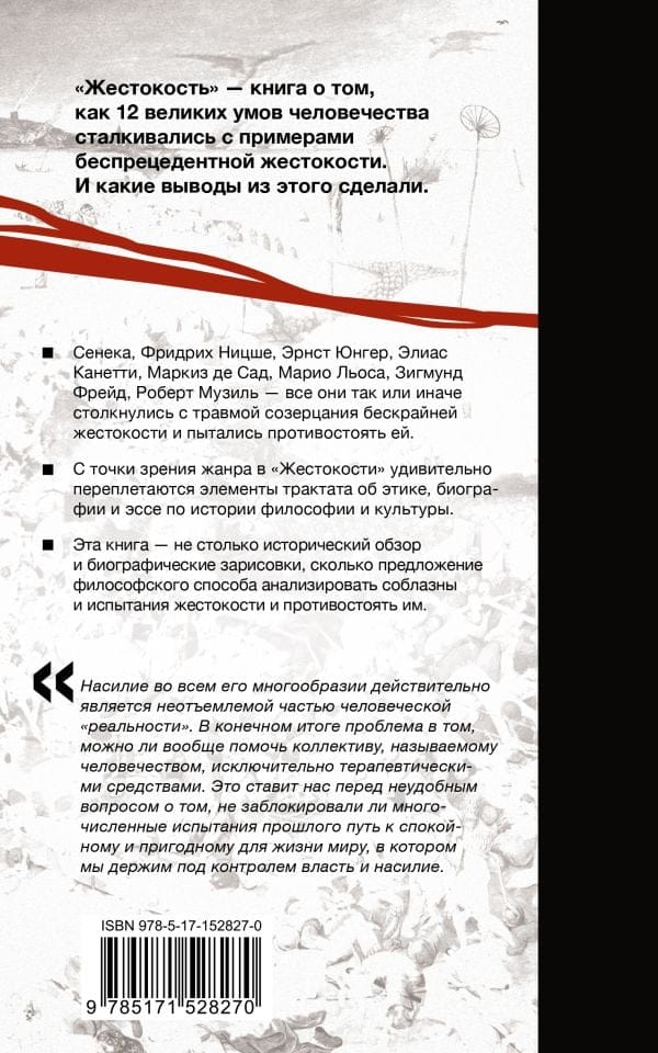 Человек — «жестокое животное». Этот радикальный тезис является отправной точкой дискурсивной истории жестокости. Ученый-культуролог Вольфганг Мюллер-Функ определяет жестокость как часть цивилизационного процесса и предлагает свой взгляд на этот душераздирающий аспект человеческой эволюции, который ускользает от обычных описаний.В своей истории из двенадцати глав — о Роберте Мюзиле и Эрнсте Юнгере, Сенеке и Фридрихе Ницше, Элиасе Канетти и Маркизе де Саде, Жане Амери и Марио Льосе, Зигмунде Фрейде и Морисе Мерло-Понти, Исмаиле Кадаре и Артуре Кёстлере — Вольфганг Мюллер-Функ рассказывает поучительную историю жестокости и предлагает философский способ противостоять ее искушениям.