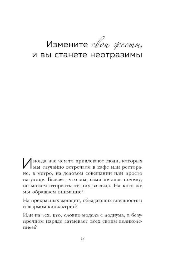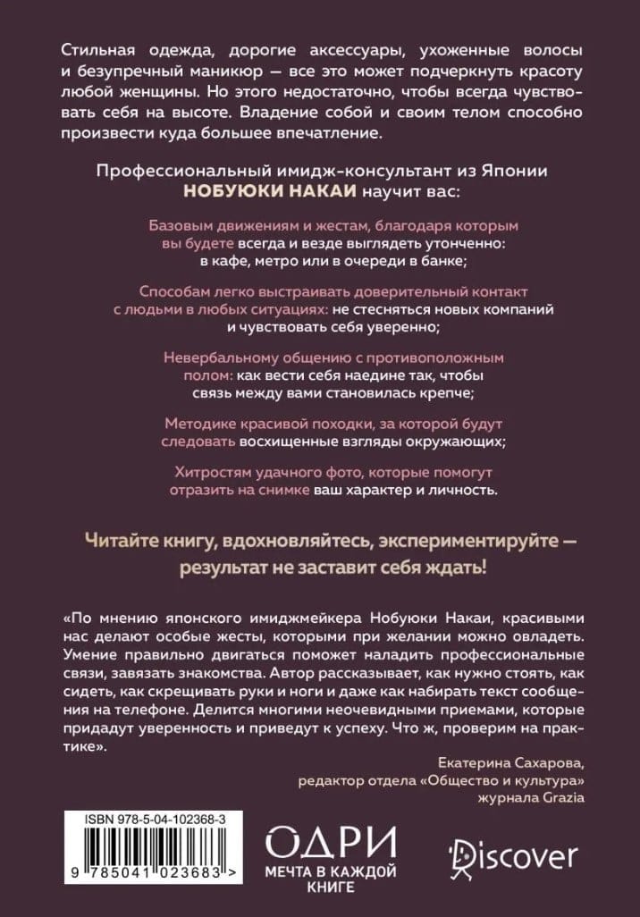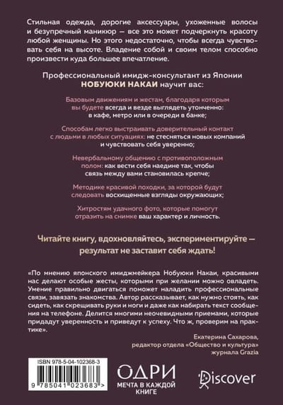 Стильная одежда, дорогие аксессуары, ухоженные волосы и безупречный маникюр - все это может подчеркнуть красоту любой женщины. Но этого недостаточно, чтобы ощущать себя на высоте. Владение собой и своим телом - вот то, что способно произвести куда большее впечатление. Профессиональный имидж-консультант из Японии Нобуюки Накаи помог добиться успеха многим восходящим звездам и теперь научит вас: базовым движениям и жестам, которые помогут везде и всегда выглядеть утонченно: в кафе, метро или в очереди в банке; способам легко выстраивать доверительный контакт с людьми в любых ситуациях: не стесняться новых компаний и чувствовать себя уверенно; невербальному общению с противоположным полом: как вести себя наедине, чтобы связь между вами становились крепче; методике красивой походки, за которой будут следовать восхищенные взгляды окружающих; хитростям удачного фото, которые помогут отразить на снимке ваш характер и личность. Читайте книгу, вдохновляйтесь, экспериментируйте, - результат не заставит себя ждать!
