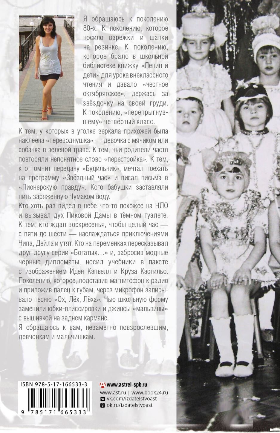 Невероятная по доброте и искренности ностальгическая повесть о тех, чья жизнь началась в год, когда навсегда улетел олимпийский мишка, и чьё детство закончилось слишком рано — когда не стало страны, в которой они родились. Это не просто рассказ о людях и вещах из прошлого, а очень интимный взгляд человека в то время, когда были живы бабушка и дедушка, когда мама была молодой и самой красивой, а жизнь была простой — и казалась бесконечной...