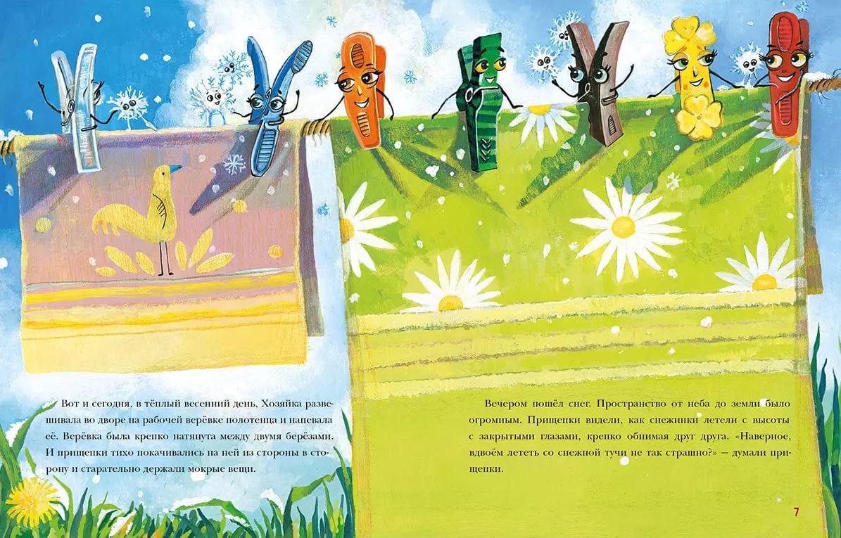 Разноцветным прищепкам досталась непростая работа. Шутка ли — в снежную бурю крепко держать бельё на верёвке? А что будет, если в самый ответственный момент прищепку пощекочет гусеница? И как это — играть с маленьким человеком в радугу? Все любят приключения! И бельевые прищепки — не исключение!