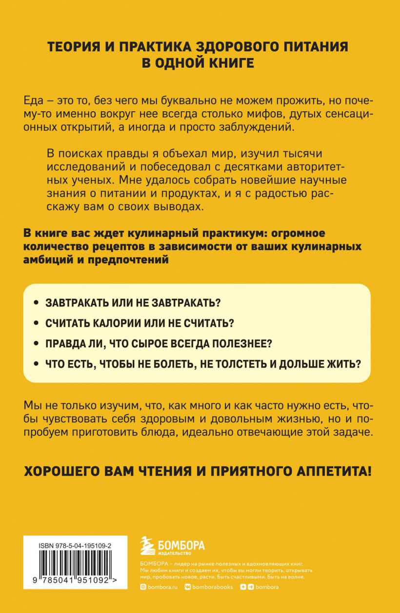 Вас ждет большой кулинарный практикум — завтраки, салаты и закуски, основные блюда, десерты и напитки — и интереснейшая теоретическая часть, из которой вы узнаете, какая еда помогает нам не болеть, не толстеть и жить дольше.