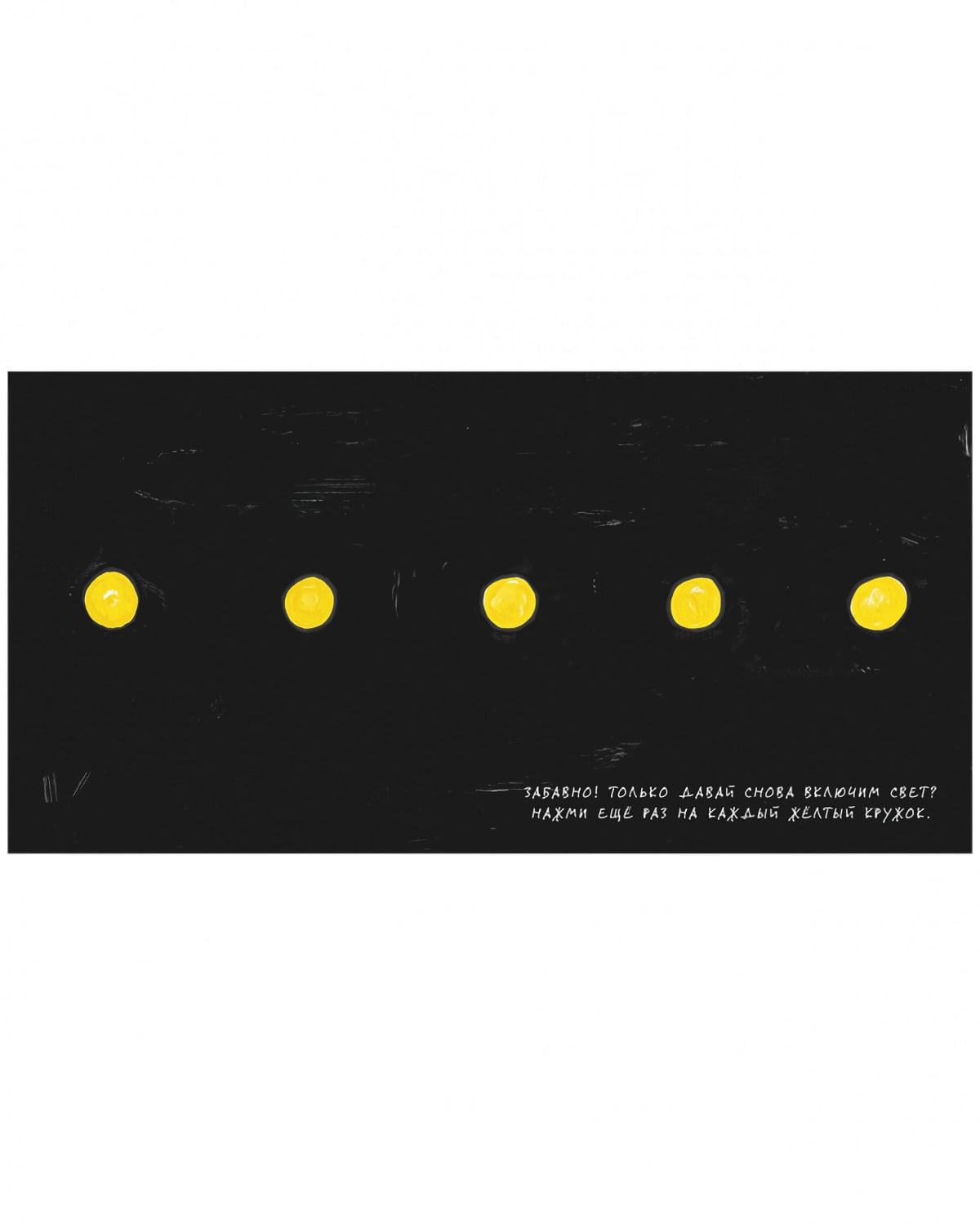 Чтобы начали происходить чудеса, понадобится помощь вашего ребенка: наколдовать больше кружочков простым хлопком в ладоши или выключить свет на страницах, потрясти и высыпать шарики из книг, а может, сдуть темноту из книги? Выполняйте интерактивные задания, переворачивайте страницы, играйте и удивляйтесь! «Живая книга» невероятно воздействует на воображение детей и захватывает внимание сильнее любой электронной игрушки. Подуйте, потрясите, похлопайте в ладоши, открывайте на любой странице и начинайте снова — забавные кружочки развеселят любого! Многочасовое веселье и радостный детский смех обеспечены: проверено маленькими поклонниками творчества Эрве Тюлле по всему миру.