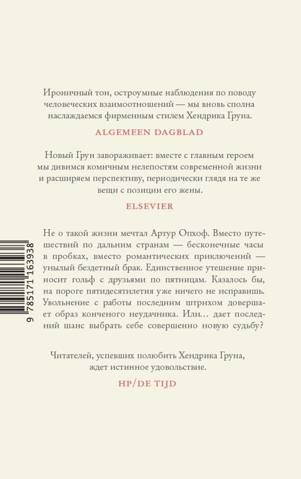 Как известно читателям, Хендрик Грун сам скучать не любит и другим не дает. Поэтому в третьем его романе нас ждет совершенно новая история, с амстердамской богадельней никак не связанная. На сей раз мы не встретимся с Груном лично, но, судя по беспощадной меткости наблюдений и неподражаемой иронии, он остается где-то рядом и подглядывает… Артур Опхоф разочарован. Ему вот-вот стукнет пятьдесят, а его жизнь — синоним уныния. Скучная работа, скучный брак без детей и без страсти, скучные часы в пробках вместо дальних странствий по экзотическим краям и острых ощущений, о которых он столько мечтал. В пятницу сыграть с друзьями в гольф — самое яркое событие недели. А тут вдобавок еще и несправедливое увольнение. Впору ставить на себе крест… или разрабатывать хитроумный план по радикальной перемене судьбы.