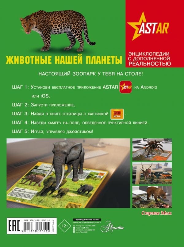 На нашей планете обитает огромное множество разнообразных животных. Но лишь считаных из них мы видели вживую. А ведь как было бы здорово потрепать по гриве царя зверей льва или прокатиться на слоне-великане. Всё это вполне возможно, если вы откроете эту книгу! Ведь у вас в руках уникальное издание с дополненной реальностью (AR) в формате интерактивных 3D-игр. Это значит, что вы не просто познакомитесь с животными Земли, читая текст и рассматривая иллюстрации, а увидите их в движении и объеме: перед вами предстанут длинношеий жираф, неповоротливый бегемот и даже кровожадный крокодил. Выполняйте задания и узнавайте больше о диких представителях фауны! А реалистичные визуальные и звуковые спецэффекты, которыми сопровождается игра, сделают чтение этой книги еще более увлекательным.