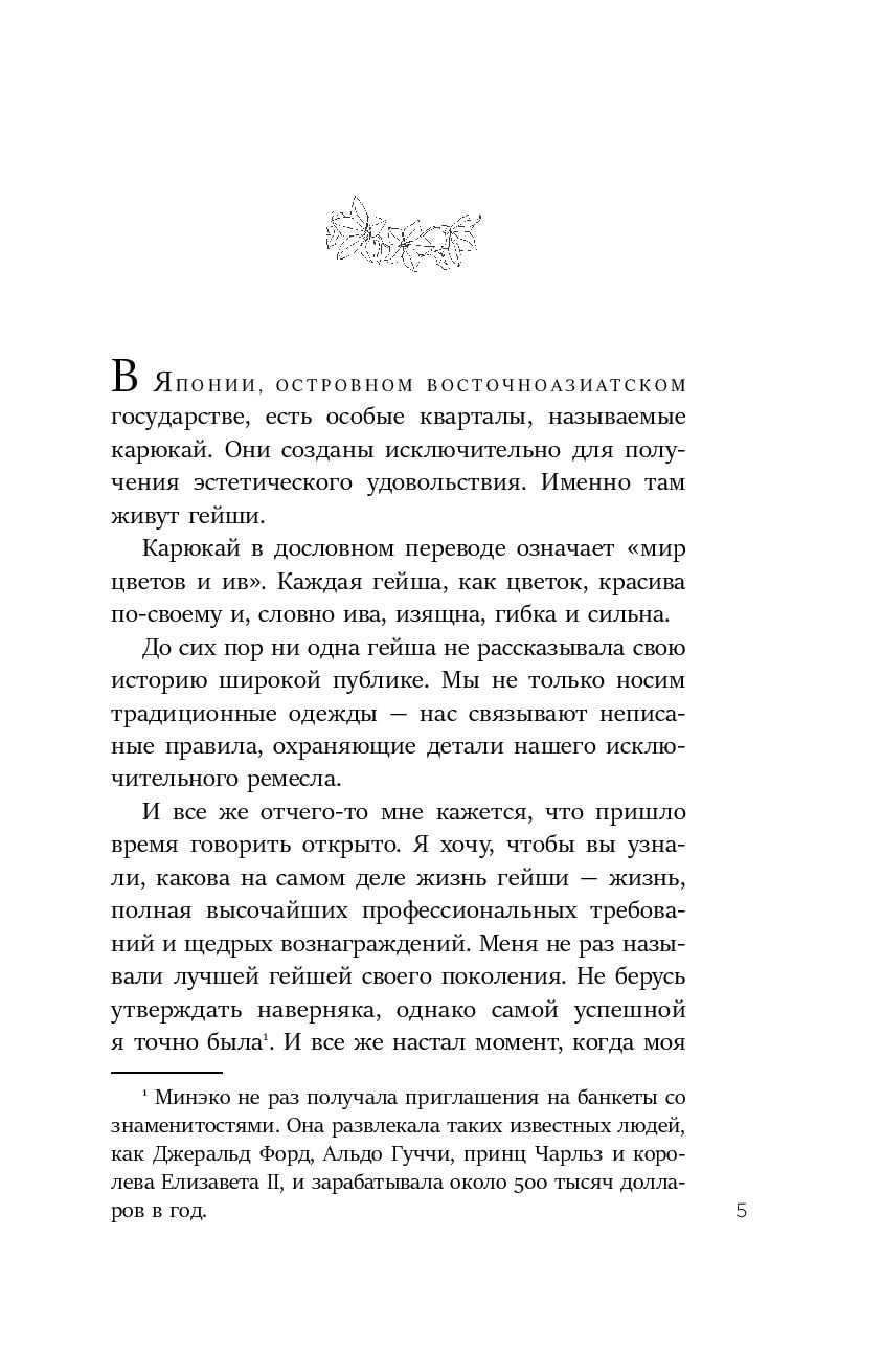 Жизнь Минэко Ивасаки была описана в бестселлере Артура Голдена «Мемуары гейши». По книге был снят одноименный фильм. Но Артур Голден допустил множество ошибок и неточностей, смешав, по мнению Минэко, искусство красоты с развратностью. И тогда она решила издать свои мемуары, где откровенно рассказала истинную правду о своей жизни.