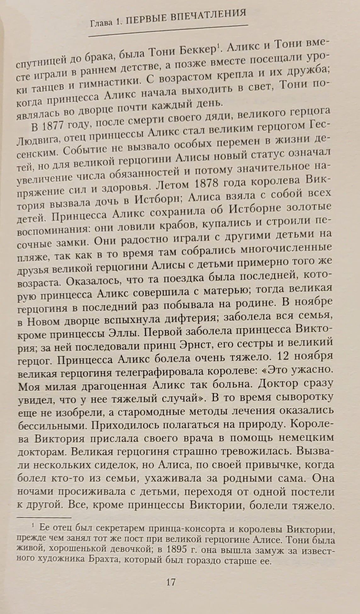 Баронесса Буксгевден (1883—1956), первый биограф русской императрицы, долгие годы была не только фрейлиной, но и преданным другом царской семьи. София Карловна, дочь русского посланника в Дании, с большой любовью, но беспристрастно рассказывает о жизни гессенской принцессы с раннего детства до последних дней. Иза, как называли баронессу при дворе, с 1913 г. неотлучно пребывала при Александре Федоровне до ссылки Романовых в Тобольск, а затем последовала за ними. Софии Карловне удалось запечатлеть множество зарисовок из жизни патронессы в счастливые времена и в дни великих печалей и горестей, сохранить бесценные сведения о взаимоотношениях в семье, подметить черты характера августейшей четы и их детей, описать особенности быта и передать атмосферу жизни при дворе. На страницах книги Александра Федоровна предстает не только как государыня, но, прежде всего, как любящая мать и жена, добрый друг и щедрая благотворительница, неустанно трудившаяся на благо своей страны и принявшая мученическую смерть вместе со всей семьей.