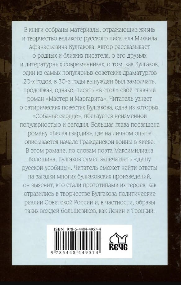 В книги собраны материалы, отражающие жизнь и творчество великого русского писателя Михаила Афанасьевича Булгакова. Автор рассказывает о родных и близких писателя, о его друзьях и литературных современниках, о том, как Булгаков, один из самых популярных советских драматургов 20-х годов, в 30-е годы вынужден был замолчать, продолжая, однако, писать «в стол» свой главный роман «Мастер и Маргарита». Читатель узнает о сатирических повестях Булгакова, одна из которых, «Собачье сердце», пользуется неизменной популярностью и сегодня. Большая глава посвящена роману «Белая гвардия», где на личном опыте описывается начало Гражданской войны в Киеве. В этом романе, по словам поэта Максимилиана Волошина, Булгаков сумел запечатлеть «душу русской усобицы». Читатель сможет найти ответы на загадки многих булгаковских произведений, он выяснит, кто стали прототипами их героев, как отразились в творчестве Булгакова политические реалии Советской России и, в частности, образы таких вождей большевиков, как Ленин и Троцкий.