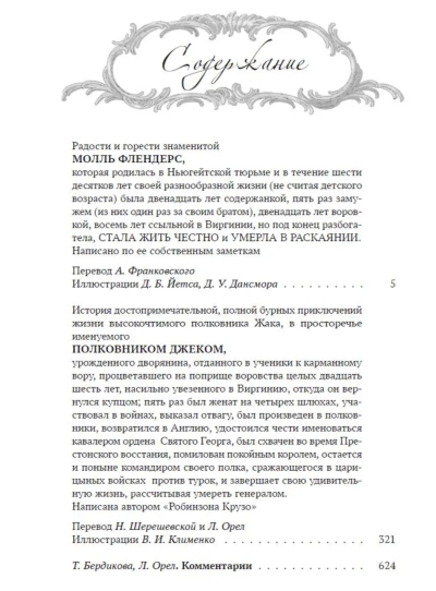 Во вторую книгу Даниэля Дефо включены два выдающихся романа английской литературы XVIII века — «Радости и горести знаменитой Молль Флендерс» и «История полковника Джека». Оба произведения объединены темой нравственного падения и последующего раскаяния, изображением жизни «снизу» и живописной хроникой эпохи. «Молль Флендерс» — это исповедь женщины, родившейся в тюрьме и прошедшей через череду браков, преступлений, обмана и ссылок. Несмотря на бесчисленные моральные падения, героиня обретает возможность для раскаяния и новой, честной жизни. Это история о выживании в жёстком мире, рассказанная с удивительной прямотой и сочувствием. «Полковник Джек» — роман о мальчике-сироте, оказавшемся в преступной среде Лондона. Джек становится вором, затем солдатом, позже попадает в ссылку и, пройдя множество испытаний, превращается в уважаемого человека. Это история нравственного роста и постоянной борьбы между искушением и добродетелью.