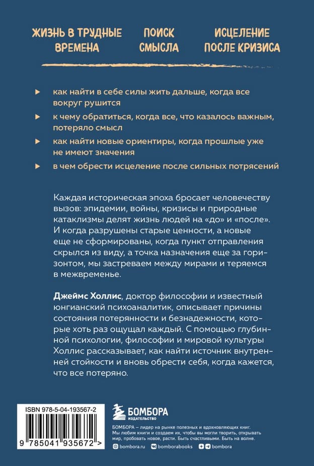 В своей книге философ Джеймс Холлис обращается к переломным для человечества периодам межвременья и свойственным им состояниям потерянности, тревоги и апатии. С помощью психологии, философии, классической литературы и мифов он показывает, как открыть в себе источник силы и ресурс, когда все вокруг разваливается.