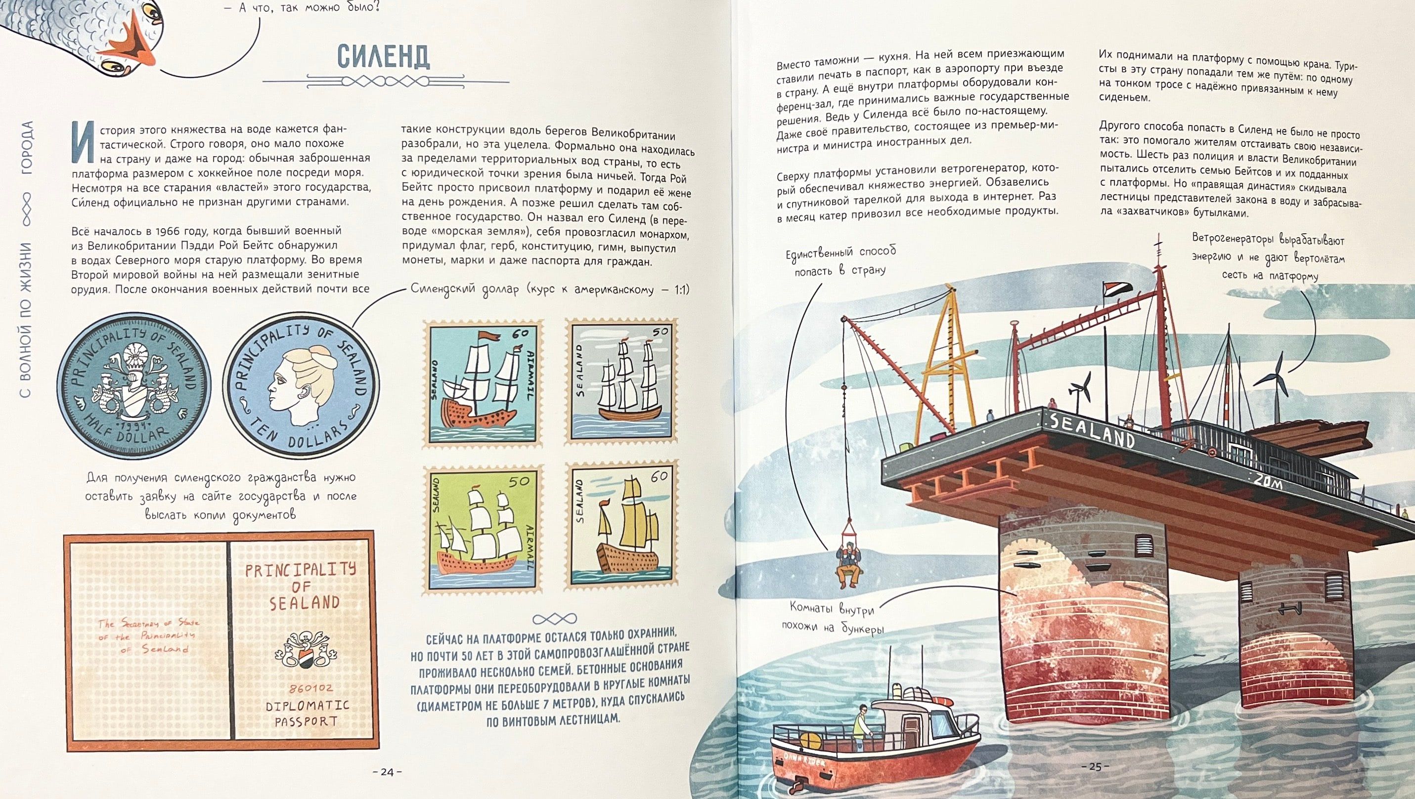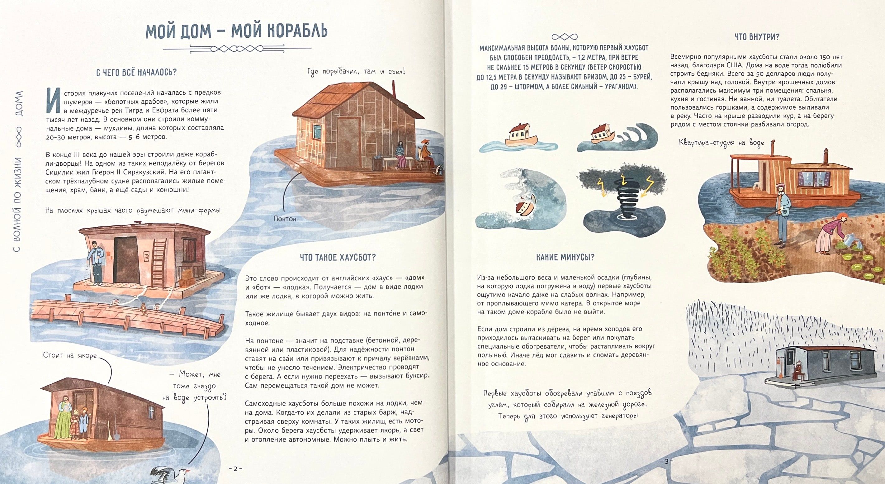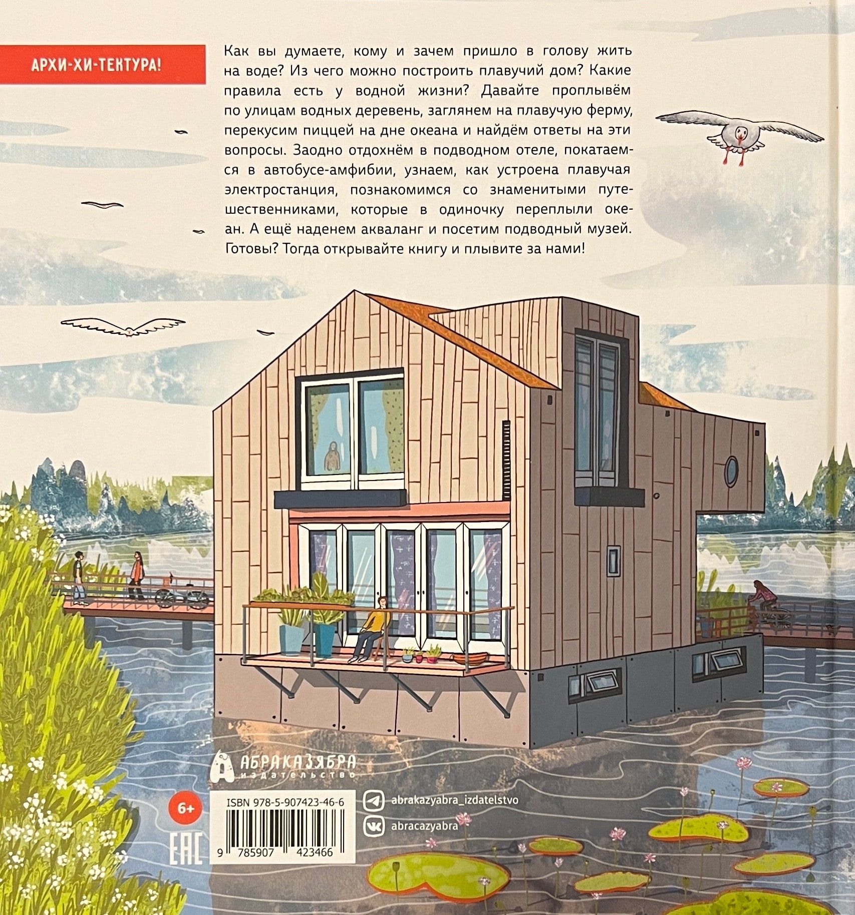 Как вы думаете, кому и зачем пришло в голову жить на воде? Из чего можно построить плавучий дом? Какие правила есть у водной жизни? Давайте проплывём по улицам водных деревень, заглянем на плавучую ферму, перекусим пиццей на дне океана и найдём ответы на эти вопросы. Заодно отдохнём в подводном отеле, покатаемся в автобусе-амфибии, узнаем, как устроена плавучая электростанция, познакомимся со знаменитыми путешественниками, которые в одиночку переплыли океан. А ещё наденем акваланг и посетим подводный музей. Готовы? Тогда открывайте книгу и плывите за нами!