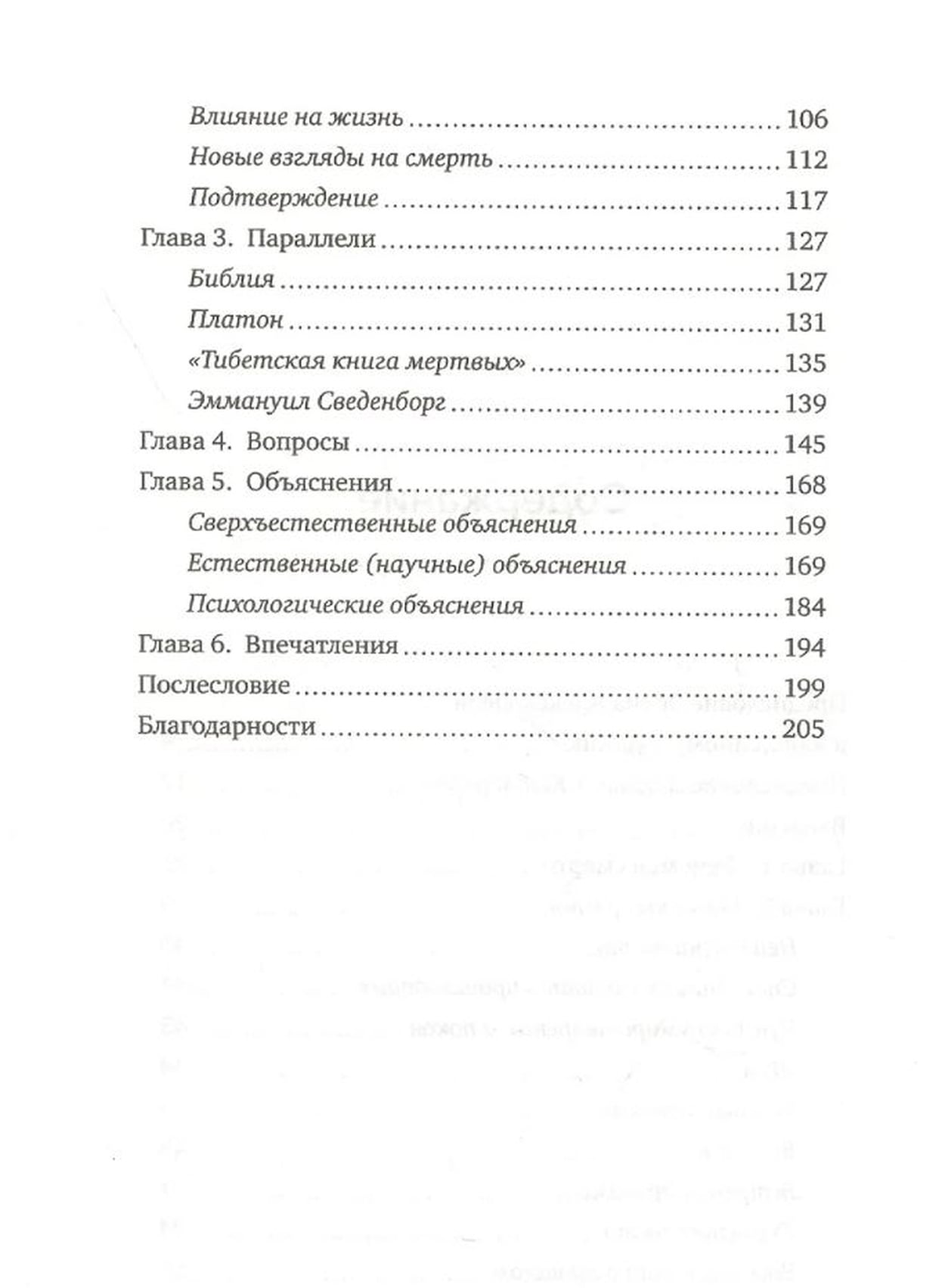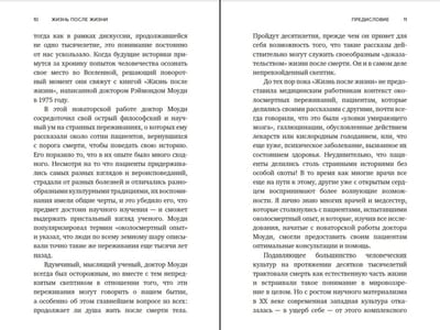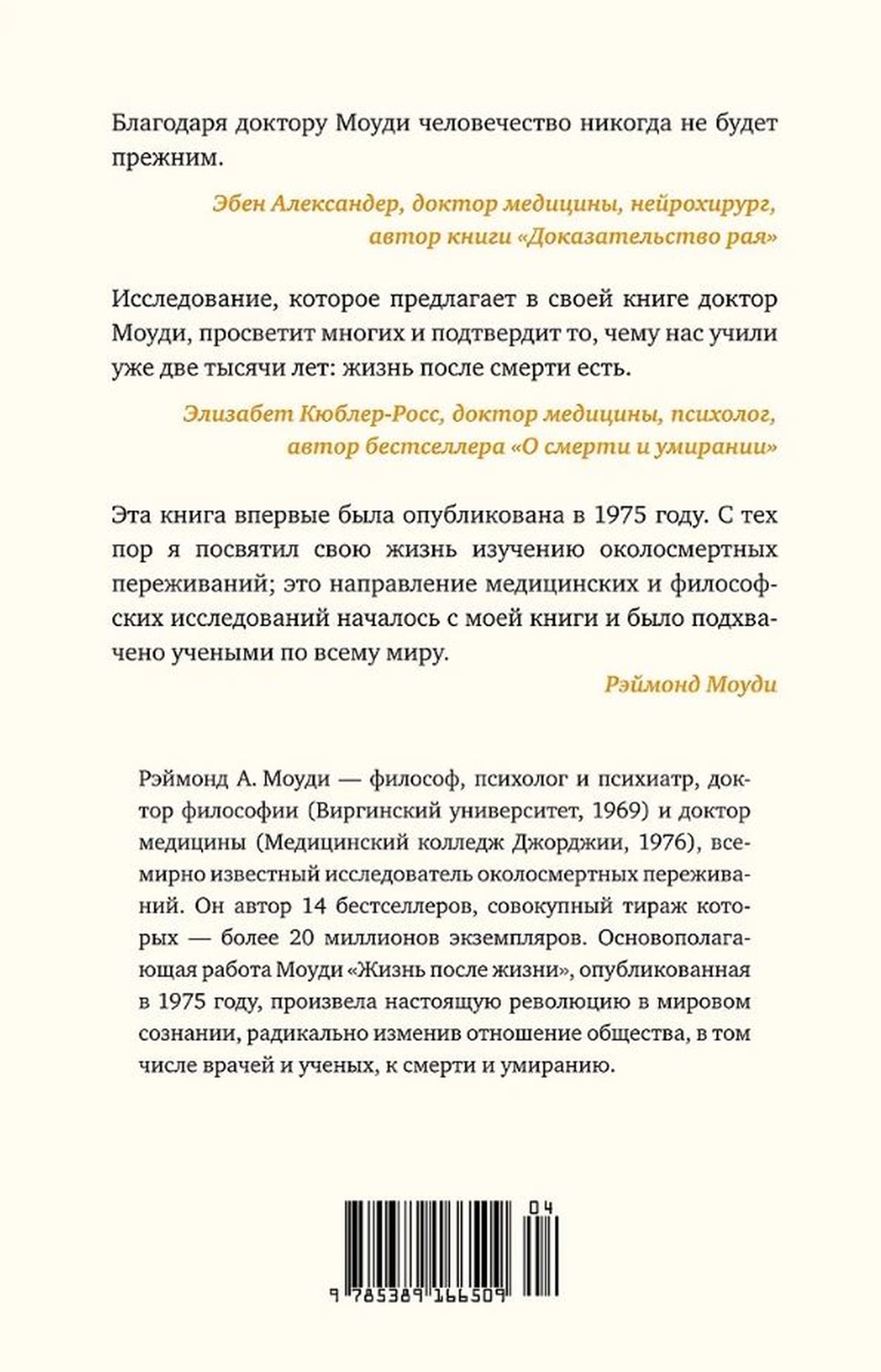 В своем уникальном труде Рэймонд Моуди — философ, психолог и психиатр — впервые описал и исследовал так называемый околосмертный опыт, или околосмертные переживания. Он проанализировал более ста отчетов пациентов, переживших клиническую смерть, и выделил общие мотивы, повторяющиеся в их рассказах, такие как громкий гул, яркий свет, туннель, выход из физического тела, встреча с умершими близкими, ожидающими «на той стороне», и с некими прекрасными светящимися существами, ретроспективный обзор всей жизни и нежелание возвращаться обратно в наш мир…