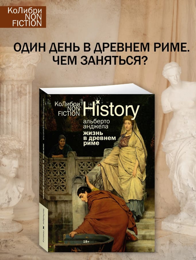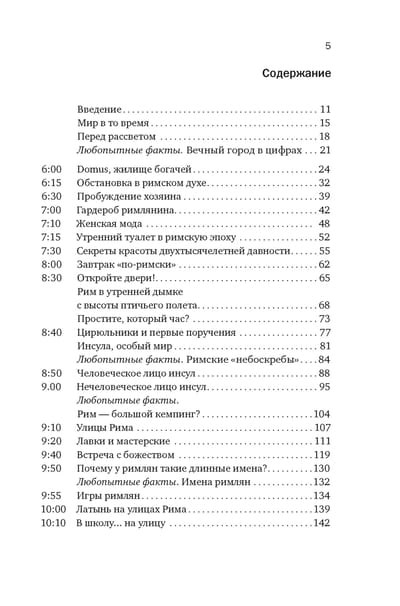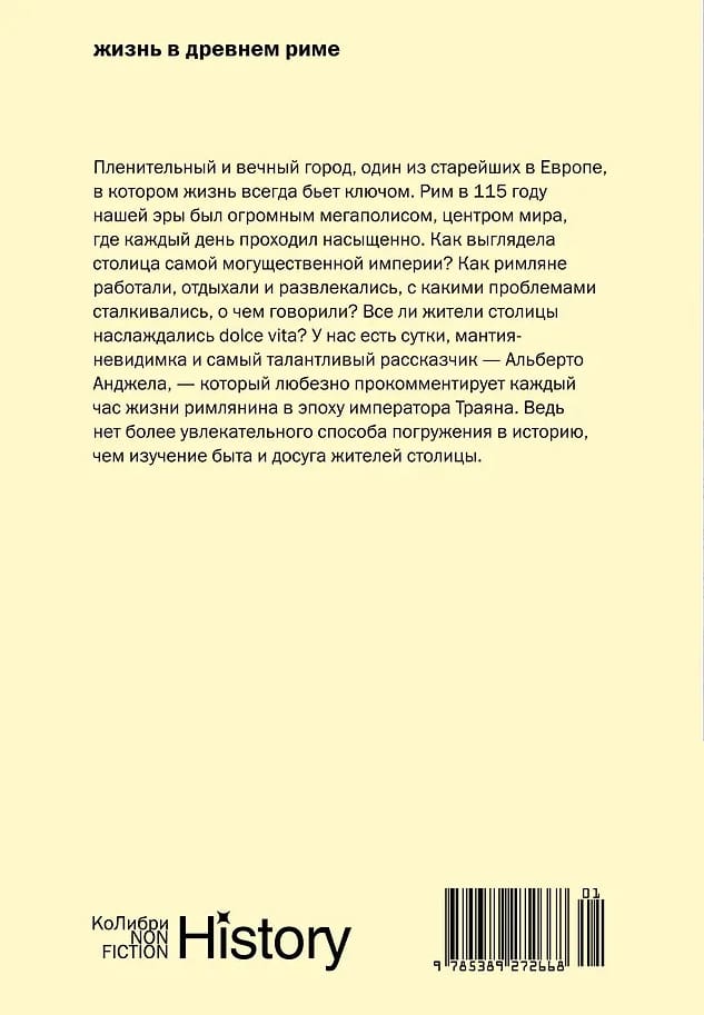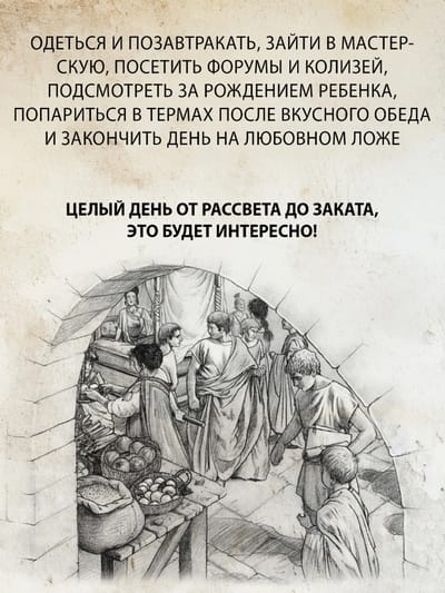 Автор предлагает нам «накрыться шапкой-невидимкой» и провести в Риме целый день, от рассвета до заката, в 115 году нашей эры: потолкаться на людной улице и заглянуть в Колизей, посетить судебное слушание и роскошные термы, отведать изысканных блюд и насладиться беседой на званом ужине. И закончить день на любовном ложе — здесь тоже за две тысячи лет ничего не изменилось.