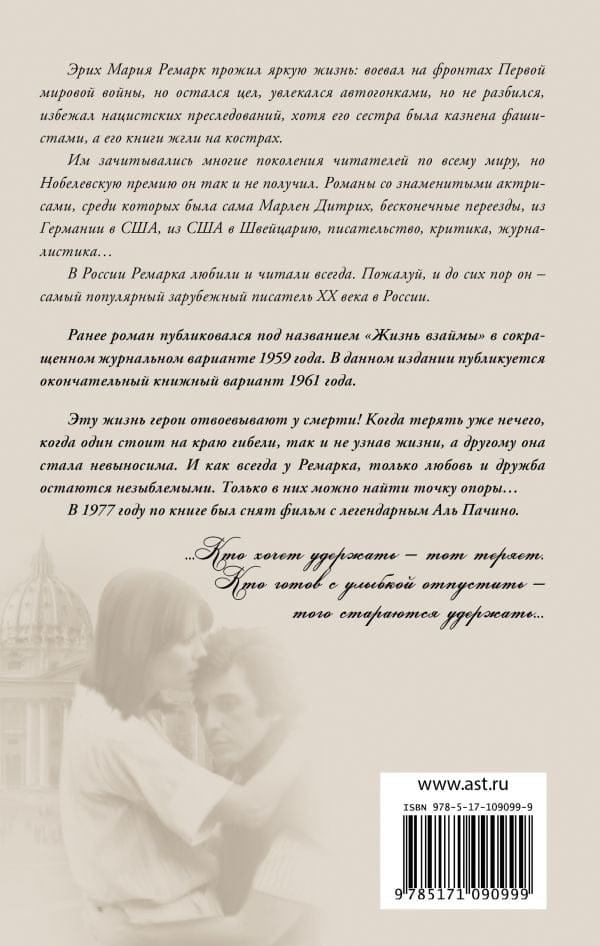 Эту жизнь герои отвоевывают у смерти! Когда терять уже нечего, когда один стоит на краю гибели, так и не узнав жизни, а другому она стала невыносима. И как всегда у Ремарка, только любовь и дружба остаются незыблемыми. Только в них можно найти точку опоры…