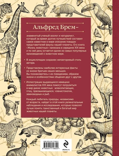 Хотите узнать больше о жизни животных по всему миру? Лучше трудов Брема не найти. Издаваясь более 150 лет, они не потеряли актуальности и по сей день. В этой энциклопедии собраны все популярные классы животных по всему миру. Очень подробно, очень понятно и невероятно полезно книга расскажет о каждом виде животного: