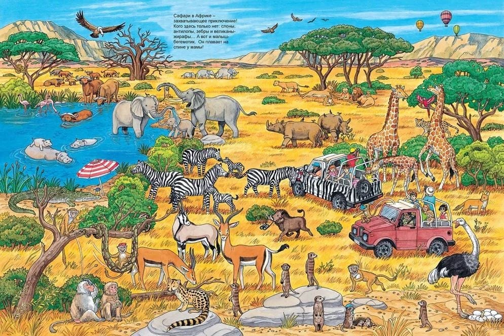 Виммельбух рассказывает о жизни самых разнообразных обитателей нашей планеты. Львы и олени, орлы и киты, жизнь животных в дикой природе и в зоопарке. Маленькие читатели будут много раз возвращаться к этой книге. Следя за приключениями ее героев, они выучат названия животных и узнают многое об их жизни.