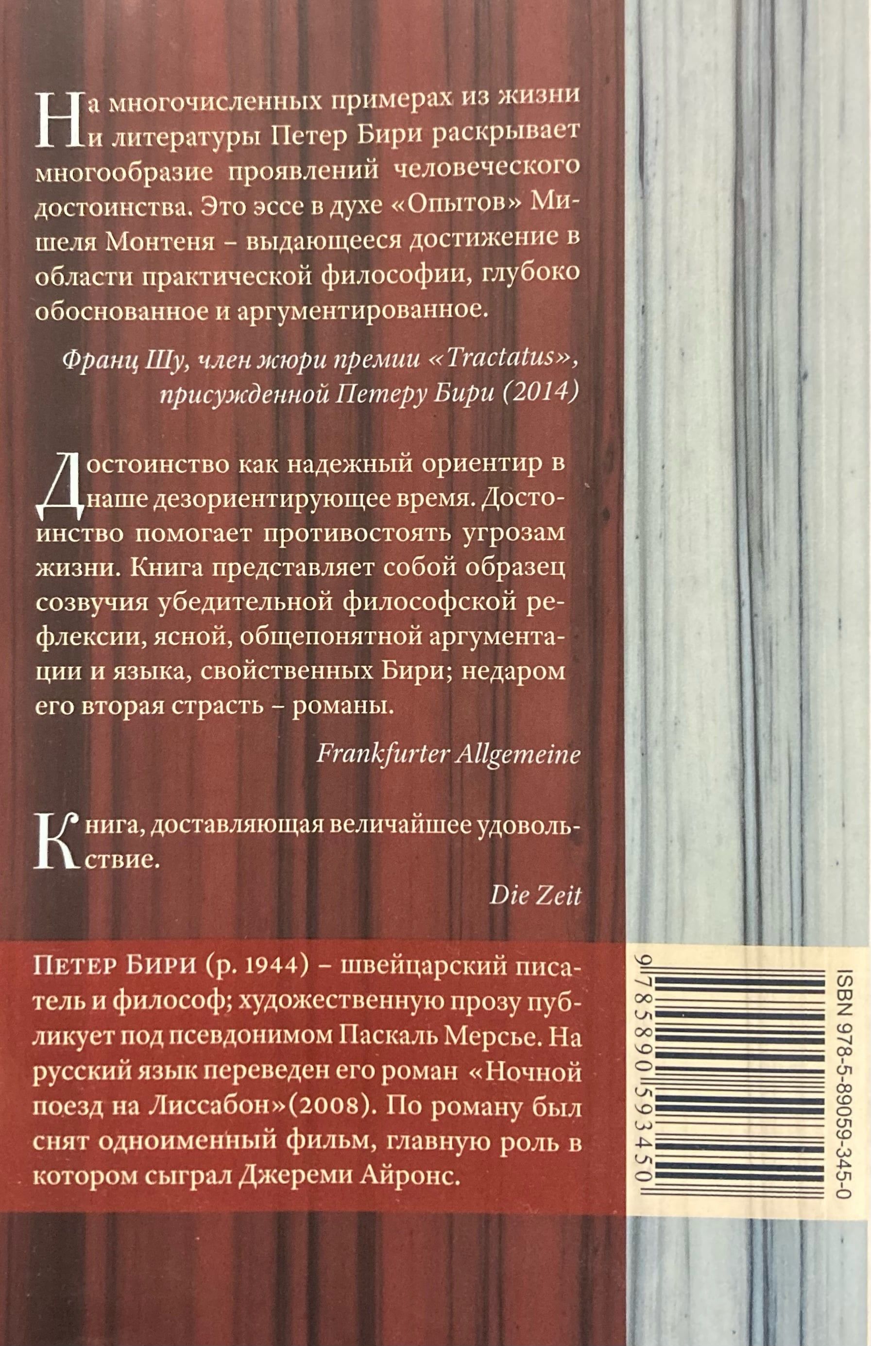 Что такое достоинство? Откуда оно берется? Что оно означает для каждого из нас? Можно ли вернуть утраченное достоинство? Швейцарско-немецкий философ и писатель Петер Бири описывает достоинство как опыт и проблему жизни в ее важнейших моментах и в ее повседневности. Автор раскрывает спектр представлений о достоинстве, анализируя его природу в многоголосой оркестровке историй, притч, интеллектуальной игры. Опираясь на примеры из собственной жизни, из мировой литературы, из кинематографа, автор увлекает читателя драматическими поисками ответа на экзистенциальный опыт угрозы человеческому достоинству, поисками равновесия, основанного на самопознании и самоопределении. Книга нацелена на защиту и обретение собственного достоинства в обществе размытых моральных ценностей и пренебрежения к личности.