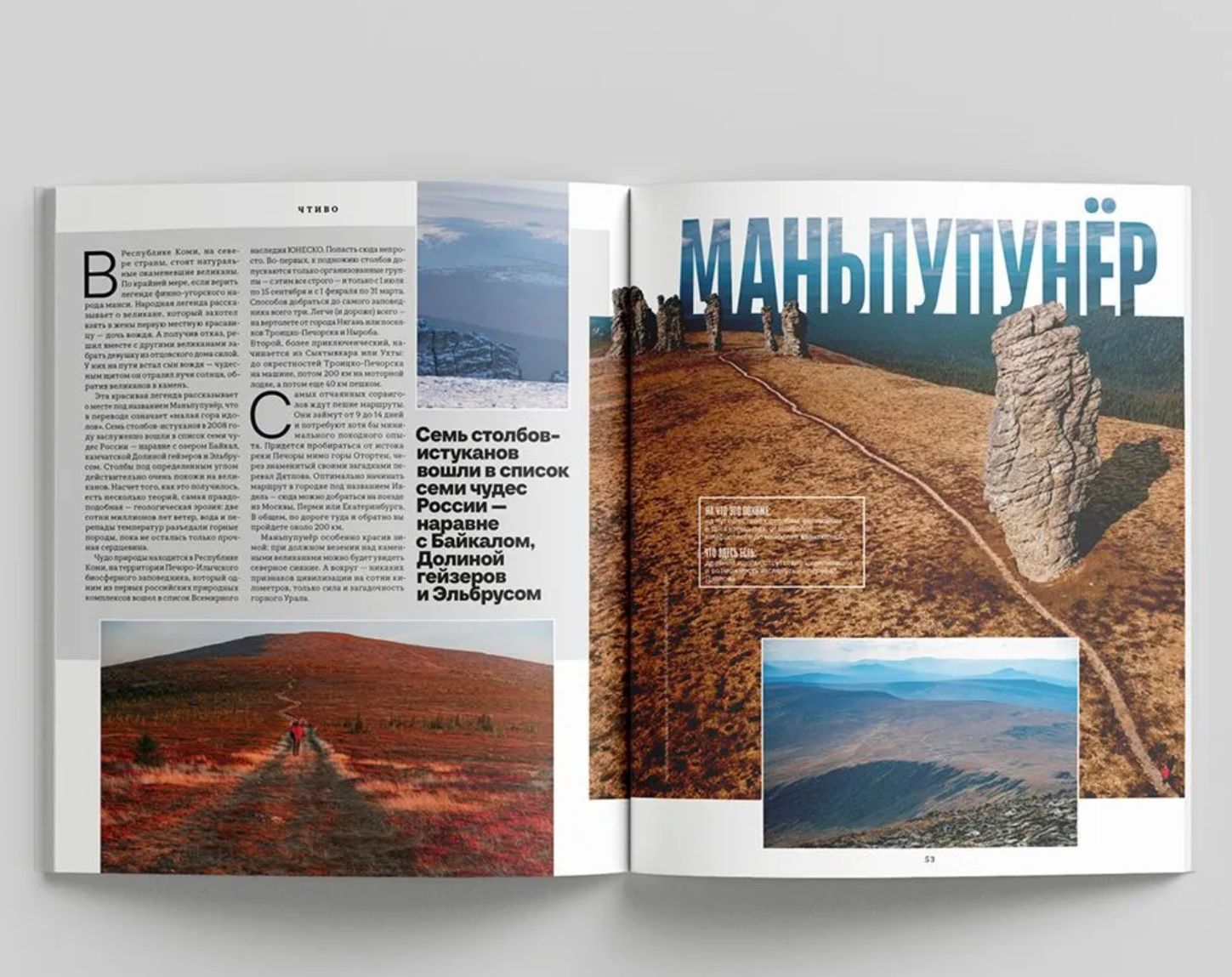 Редакция подготовила большой материал о том, как набраться впечатлений, не покидая Россию. Это гид по невероятным местам, которые часто остаются за пределами страниц популярных путеводителей. Северное сияние, окаменевшие великаны и памятник, который открывал российский император. Также гид отвечает на вопросы, почему вам непременно нужно на плато Путорана и в Маньпупунёр (и где это вообще).