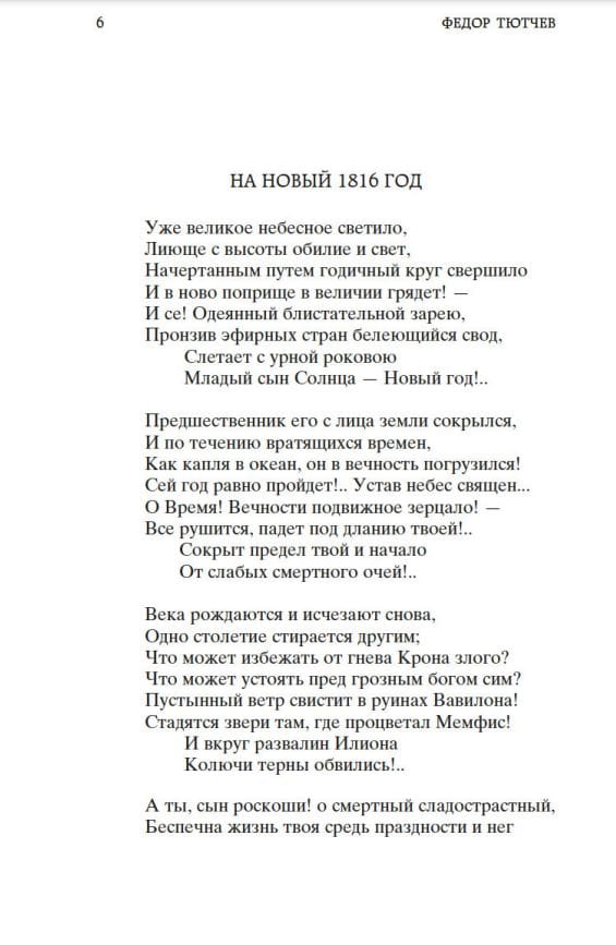 В сборник включены наиболее значительные произведения крупнейшего русского поэта XIX века Федора Ивановича Тютчева (1803–1873). Его лирика отличается интимностью, исповедальностью, саморефлексией и вместе с тем философской наполненностью и многозначностью. «Весенняя гроза», «Есть в осени первоначальной...», «Зима недаром злится...», «Умом Россию не понять...», «Silentium!», «Нам не дано предугадать...», «Я встретил вас — и все былое...» — эти и другие стихотворения относятся к шедеврам отечественной литературы. Свойственные Тютчеву краткость, почти фрагментарность, внимание к деталям, мимолетным мгновениям бытия уравновешиваются универсальностью авторской мысли, выходящей к общезначимой проблематике, что сообщает его поэтическому наследию вневременную актуальность.