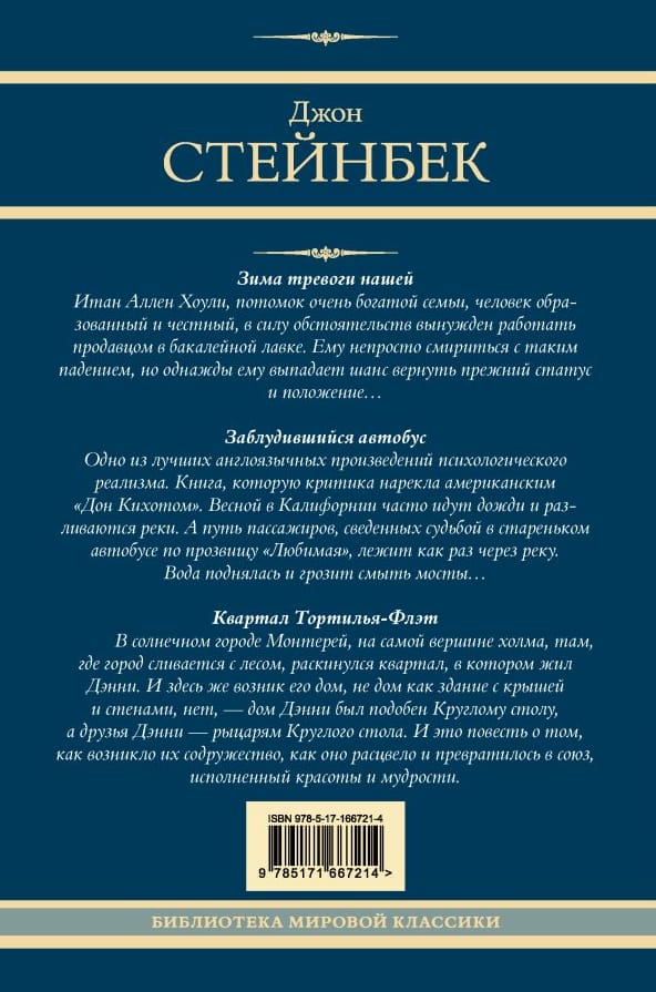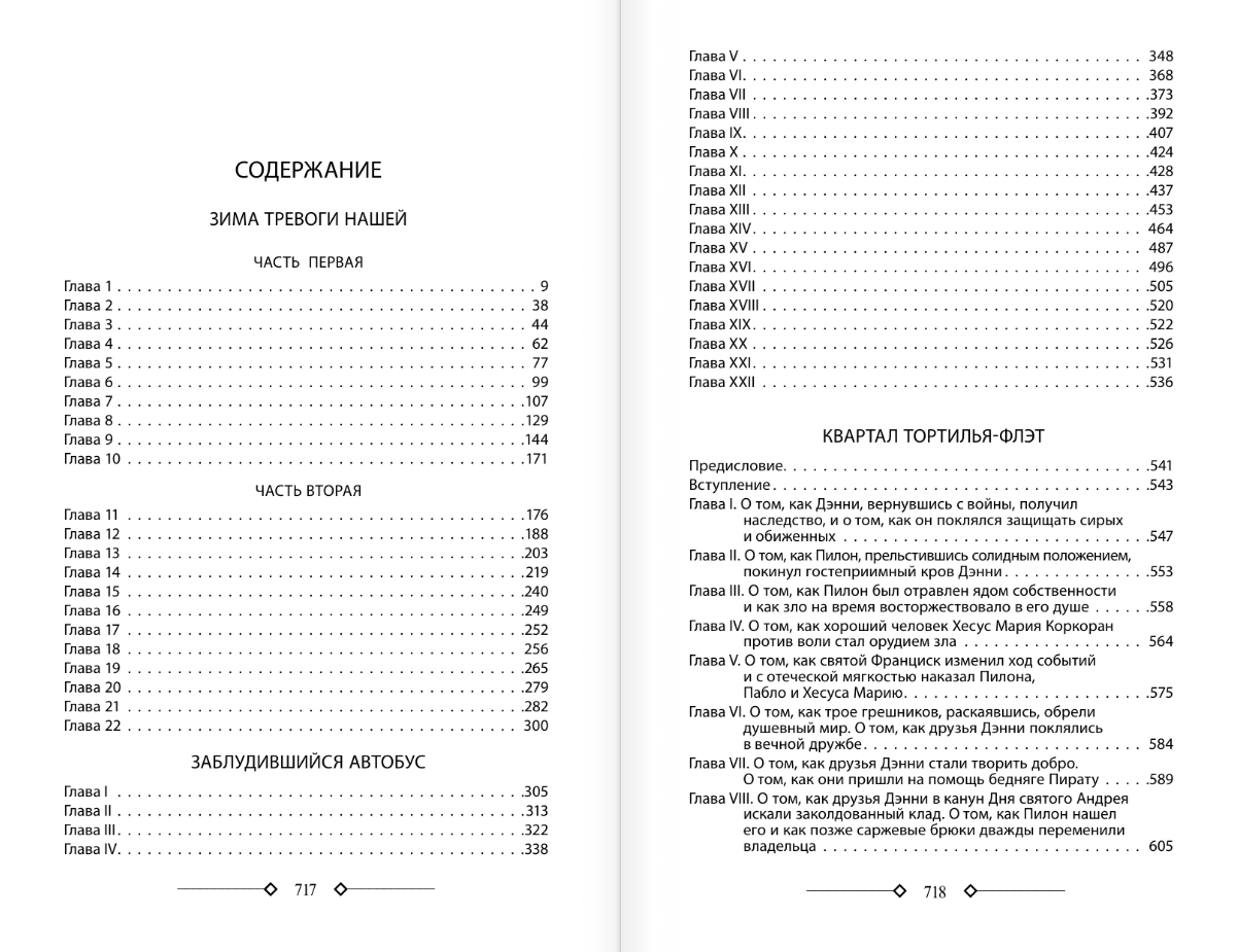 В сборник включены романы, представляющие разные периоды творчества писателя: «‎Зима тревоги нашей»‎, «‎Заблудившийся автобус»‎ и «‎Квартал Тортилья-Флэт»‎.