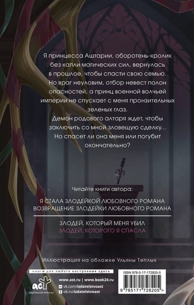 Я принцесса Аштарии, оборотень-кролик без капли магических сил, вернулась в прошлое, чтобы спасти свою семью. Но враг неуловим, отбор невест полон опасностей, а принц военной волчьей империи не спускает с меня пронзительных зеленых глаз. Демон родового алтаря ждет, чтобы заключить со мной зловещую сделку... Но спасет ли она меня или погубит окончательно?