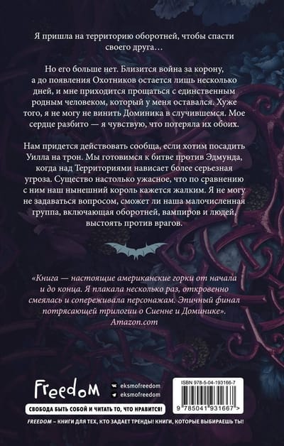 Но его больше нет. Близится война за корону, а до появления Охотников остается лишь несколько дней, и мне приходится прощаться с единственным родным человеком, который у меня оставался. Хуже того, я не могу не винить Доминика в случившемся. Мое сердце разбито — я чувствую, что потеряла их обоих. Нам придется действовать сообща, если хотим посадить Уилла на трон. Мы готовимся к битве против Эдмунда, когда над Территориями нависает более серьезная угроза. Существо настолько ужасное, что по сравнению с ним наш нынешний король кажется жалким. Я не могу не задаваться вопросом, сможет ли наша малочисленная группа, включающая оборотней, вампиров и людей, выстоять против врагов?