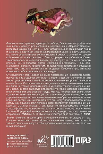 От создателей этих известных ныне произведений изобразительного искусства нас отделяют сотни лет, а порой и целые тысячелетия. Эти люди существовали в иной системе жизненных координат и верили в иных богов. Сохранившиеся с тех давних времен памятники призваны были не только радовать глаз и удивлять тонкостью исполнения, но и несли в себе зачастую определенную идею, которую современники считывали без особого труда. Мы же, получая при знакомстве с данными памятниками сугубо эстетическое удовольствие, нередко упускаем из виду их смысловое значение, не обращая внимания на говорящие детали или не понимая, что они могут подразумевать, и тем самым мы лишаем себя полноценного восприятия произведений искусства. Смыслы знаков и символов почти невозможно случайно «расшифровать», их нужно знать. И в этом вам поможет новая книга Натальи Кортуновой – известного искусствоведа, старшего научного сотрудника ГМИИ им. А.С. Пушкина, куратора ряда выставок в ГМИИ.