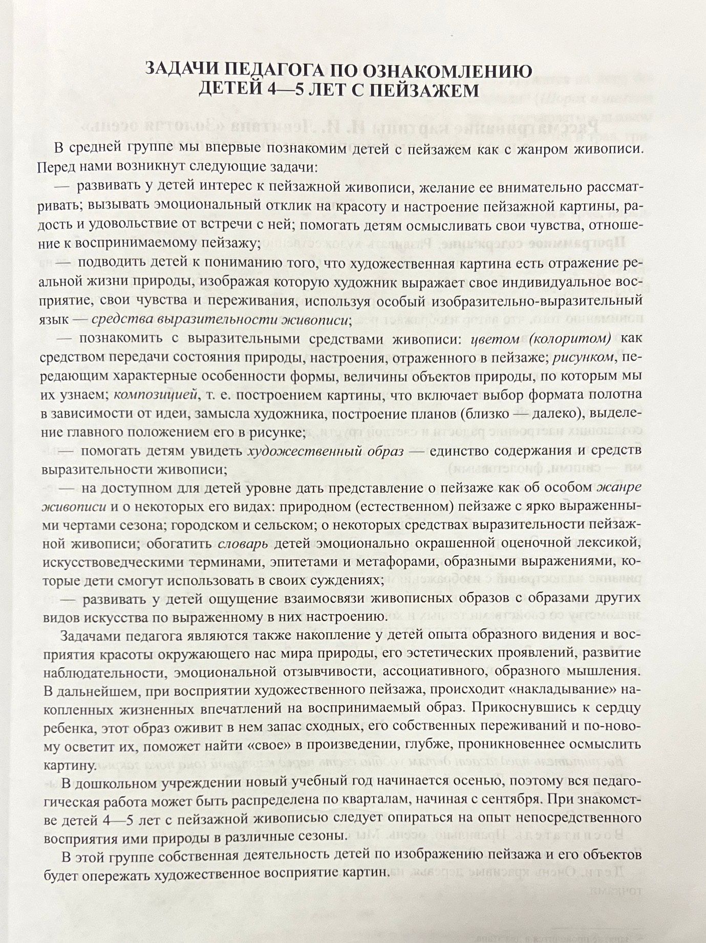 Художественный пейзаж - высшая ступень восприятия человеком природы. Научить детей не просто смотреть, а видеть, расшевелить чувства, разбудить воображение, ассоциации, помочь проникнуться смыслом и гармонией живописного пейзажа - важные задачи взрослых. Издание ориентировано на педагогов дошкольных образовательных учреждений, студентов педагогических вузов и колледжей, руководителей художественных кружков и студий, родителей и гувернеров.