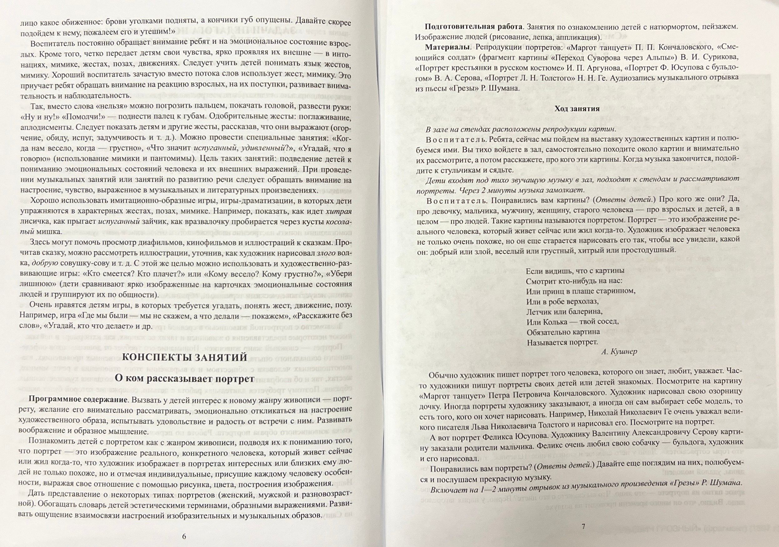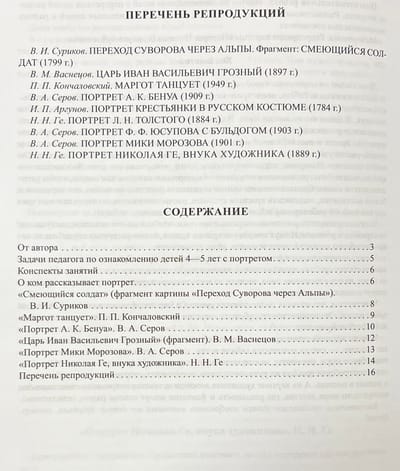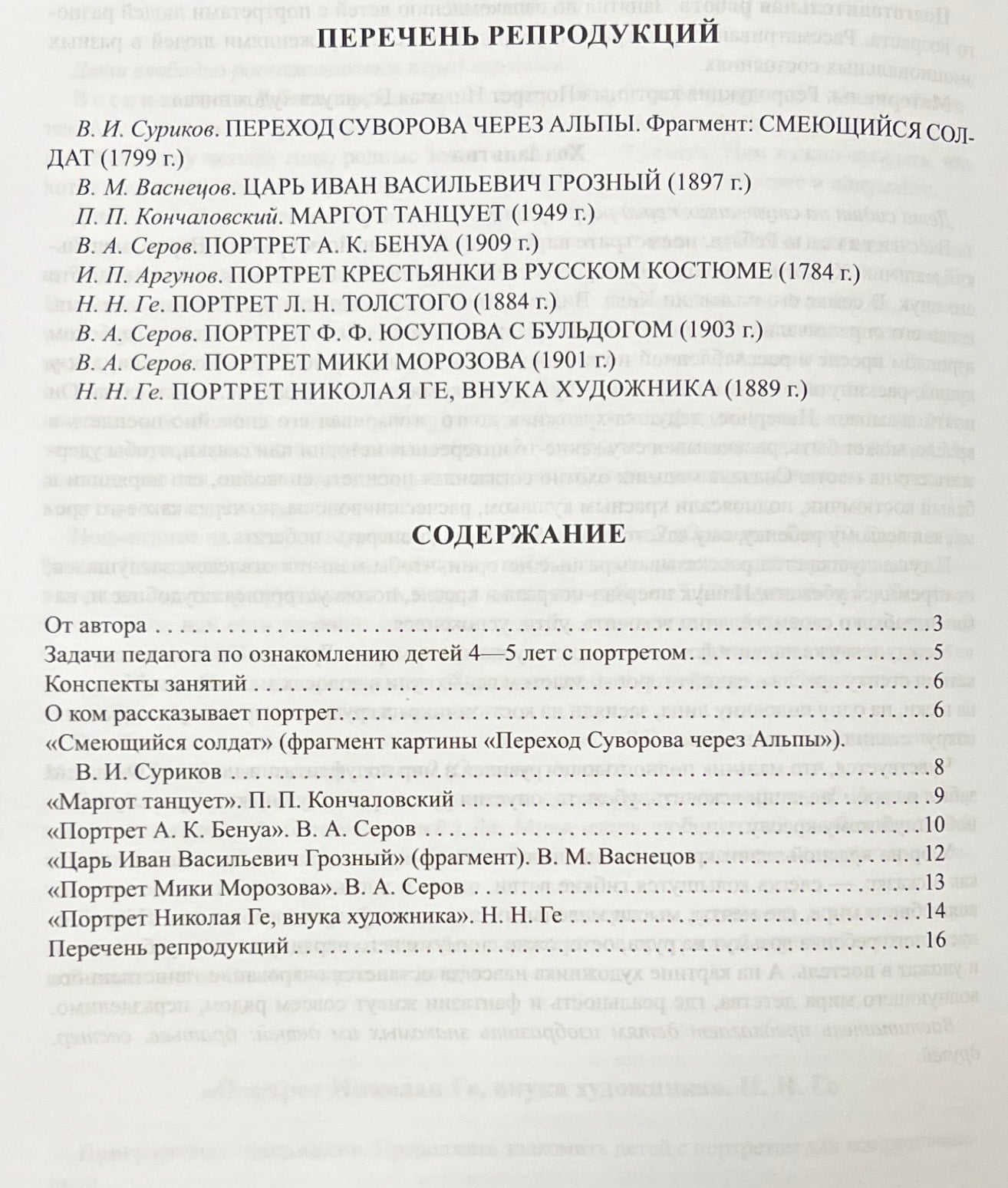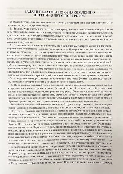 В альбоме предложена методика педагогической работы, представлены конспекты занятий и цветные репродукции картин известных художников для ознакомления дошкольников 4—5 лет с портретной живописью.