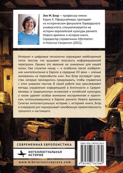 Интернет и цифровые технологии порождают необозримый поток текстов, что вызывает опасность информационной перегрузки. Однако это явление не уникально для нашей эпохи. Уже столетия назад — и особенно после изобретения книгопечатания в Европе в середине XV века — ученые жаловались на переизбыток книг. Энн Блэр исследует те средства, которые приходилось придумывать, чтобы справиться с этим шквалом текстов. В своей работе она прослеживает методы управления информацией в Античности и Средневековье, в традиционных исламской и китайской культурах, а также уделяет особое внимание инструментам и практикам, использовавшимся в Европе раннего Нового времени. Сочетая интеллектуальную историю с историей книги, Блэр в очередной раз подчеркивает неизбежную преемственность прошлого и настоящего.