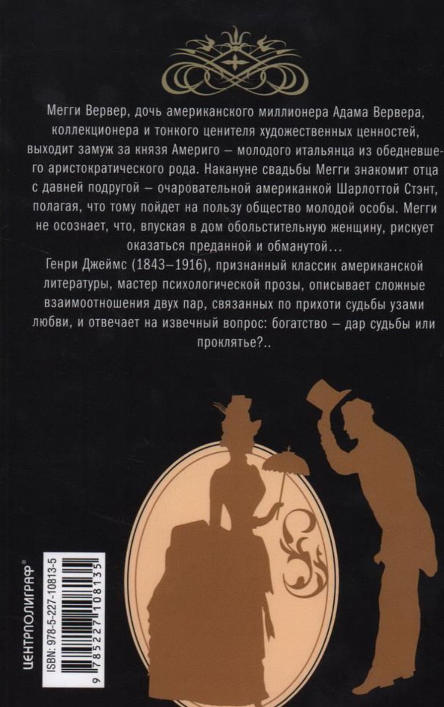 Мегги Вервер, дочь американского миллионера Адама Вервера, коллекционера и тонкого ценителя художественных ценностей, выходит замуж за князя Америго — молодого итальянца из обедневшего аристократического рода. Мегги влюблена и счастлива, однако ее тревожит мысль, что ее давно овдовевший отец, увлеченный совершенствованием своей коллекции, останется совсем один. Накануне свадьбы Мегги знакомит отца с давней подругой — очаровательной американкой Шарлоттой Стэнт, полагая, что тому пойдет на пользу общество молодой особы. Мегги не осознает, что, впуская в дом обольстительную женщину, рискует быть преданной и обманутой… Генри Джеймс (1843—1916), признанный классик американской литературы, мастер психологической прозы, описывает сложные взаимоотношения двух пар, связанных по прихоти судьбы узами любви, и отвечает на извечный вопрос: богатство — дар судьбы или проклятье?..