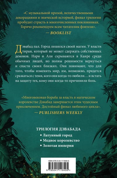 Город лишился своей магии. У власти тиран, который не может сдержать собственных демонов. Нари и Али скрываются в Каире среди обычных людей, но полны решимости вернуться и спасти своих близких. Они понимают, что для того, чтобы изменить мир, им, возможно, придется сражаться с теми, кого они когда-то любили… и встать на защиту тех, кому они когда-то причинили боль.   Финал "Трилогии Дэвабада" - возвращение в магический мир джиннов.