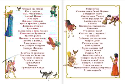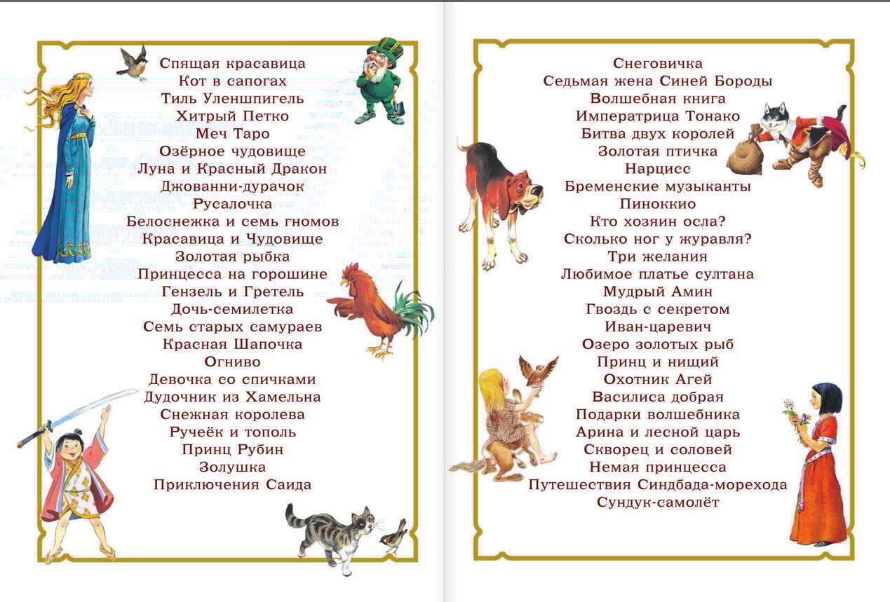 В книгу вошли сказки Ш. Перро, Х. К. Андерсена, братьев Гримм, народные сказки европейские, русские, японские, китайские, арабские и турецкие. Самые известные и распространённые сюжеты пересказали Л. Яхнин, А. Ганзен, Е. Карганова, М. Тарловский и другие.