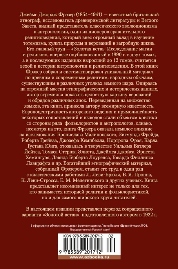 Джеймс Джордж Фрэзер (1854–1941) — известный британский этнограф, исследователь древнеримской литературы и Ветхого Завета, видный представитель классического эволюционизма в антропологии, один из пионеров сравнительного религиоведения, который внес огромный вклад в изучение тотемизма, культа природы и верований в загробную жизнь. Его главный труд – «Золотая ветвь: Исследование магии и религии», впервые опубликованный в 1890 г. в двух томах, а в последующих изданиях выросший до 12 томов, считается вехой в истории антропологии и религиоведения. В этой книге Фрэзер собрал и систематизировал уникальный материал по древним и современным религиям, народным обычаям, существующим в различных уголках земного шара. Опираясь на огромный массив этнографических и исторических данных, автор стремился показать целостную картину верований и обрядов различных эпох. Переведенная на множество языков, эта книга принесла автору всемирную известность и представляет несомненный интерес не только для тех, кто занимается историей религии и фольклористикой, но и для самого широкого круга читателей. В настоящем издании представлен перевод сокращенного варианта книги, подготовленного автором в 1922 г.