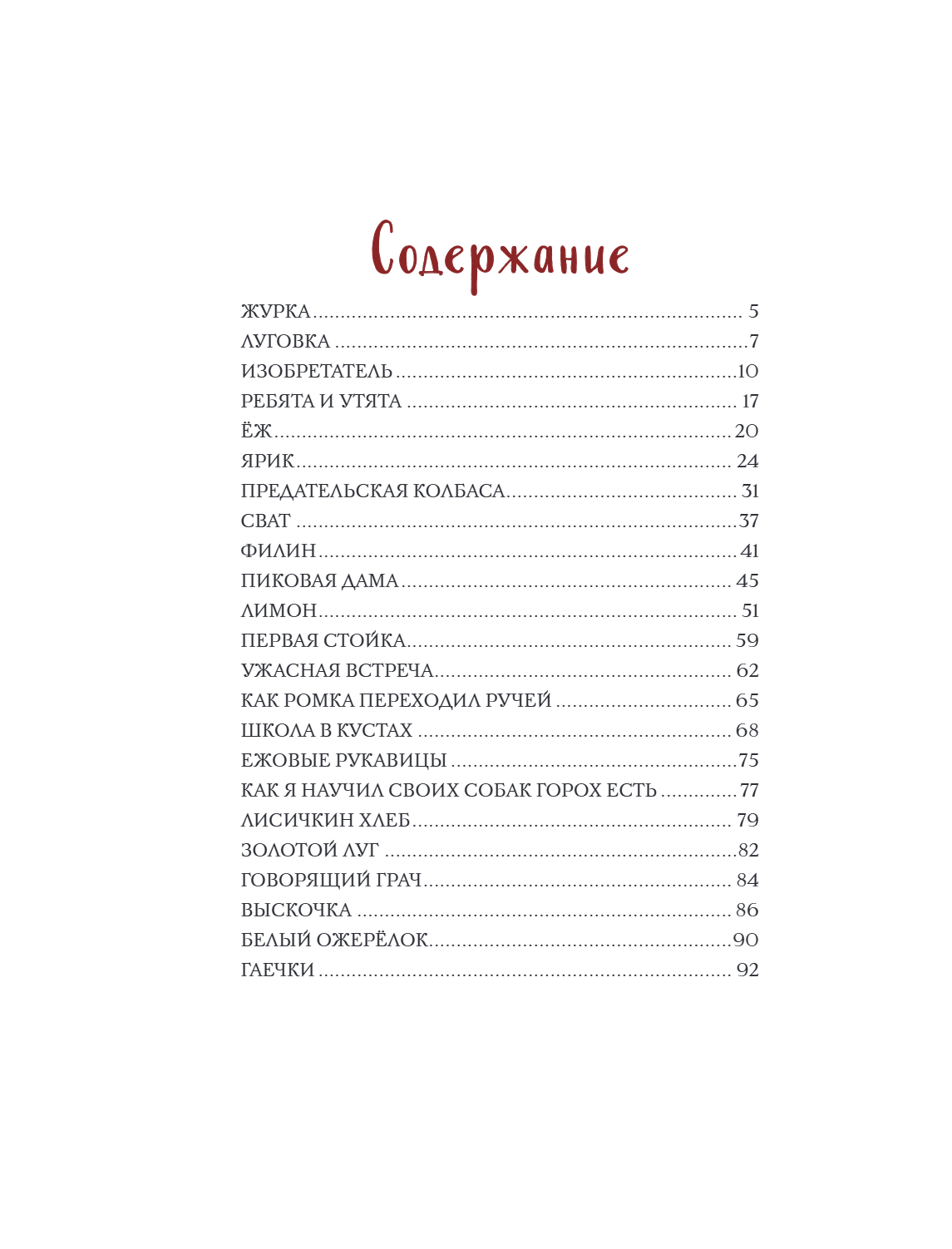 В книгу вошло 38 рассказов, в том числе произведения, известные нескольким поколениям с раннего детства: «Журка», «Изобретатель», «Предательская колбаса», «Ёж», «Школа в кустах». Образное повествование чем-то напоминает русскую народную песню, вызывая в душе читателей живой и тёплый отклик.
