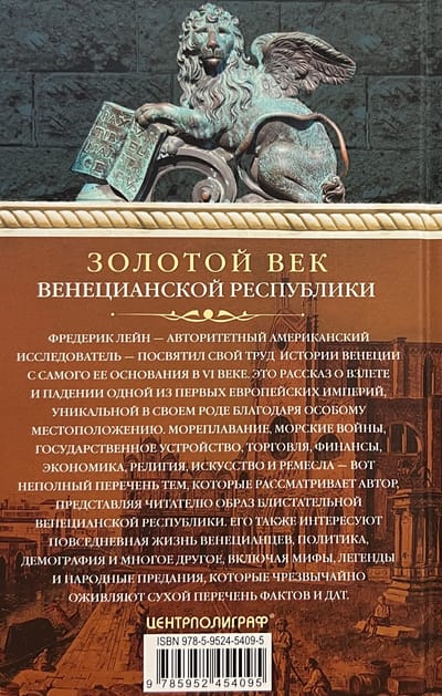 Фредерик Лейн — авторитетный американский исследователь — посвятил свой труд истории Венеции с самого ее основания в VI веке. Это рассказ о взлете и падении одной из первых европейских империй — уникальной в своем роде благодаря особому местоположению. Мореплавание, морские войны, государственное устройство, торговля, финансы, экономика, религия, искусство и ремесла — вот неполный перечень тем, которые рассматривает автор, представляя читателю образ блистательной Венецианской республики. Его также интересует повседневная жизнь венецианцев, политика, демография и многое другое, включая мифы, легенды и народные предания, которые чрезвычайно оживляют сухой перечень фактов и дат.