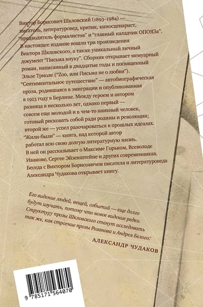 В настоящее издание вошли три произведения Виктора Шкловского, а также уникальный личный документ «Письма внуку». Сборник открывает мемуарный роман, написанный в двадцатые годы и посвященный Эльзе Триоле («Zoo, или Письма не о любви»). «Сентиментальное путешествие» — автобиографическая проза, родившаяся в эмиграции и опубликованная в 1923 году в Берлине. Между героем и автором разница в несколько лет, однако первый — совсем еще молодой и в чем‑то наивный человек, готовый рисковать собой ради родины и революции; второй же — успел разочароваться в прошлых идеалах. «Жили‑были» — книга, над которой автор работал всю свою долгую литературную жизнь. В ней он рассказывает о Максиме Горьком, Всеволоде Иванове, Сергее Эйзенштейне и других современниках.
