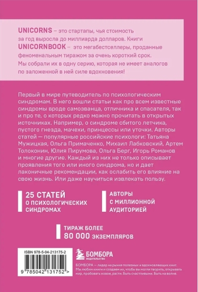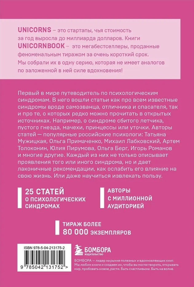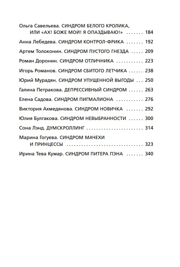 В книгу вошли статьи как про всем известные синдромы, вроде самозванца, отличника и спасателя, так и про те, о которых редко можно прочитать в открытых источниках. Например, о синдроме сбитого летчика, пустого гнезда, мачехи принцессы или уточки.