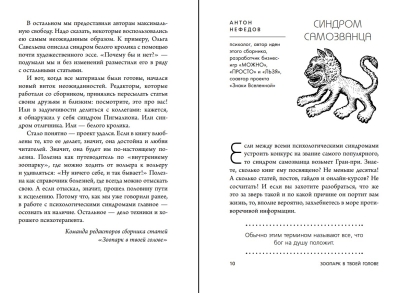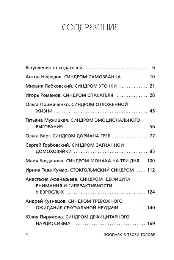 Авторы статей — популярные российские психологи: Татьяна Мужицкая, Ольга Примаченко, Михаил Лабковский, Артем Толоконин, Юлия Пирумова, Ольга Берг, Игорь Романов и многие другие. Каждый из них не только описывает проявления того или иного синдрома, но и дает лаконичные рекомендации, как ослабить его влияние на свою жизнь. Или даже научиться извлекать пользу.